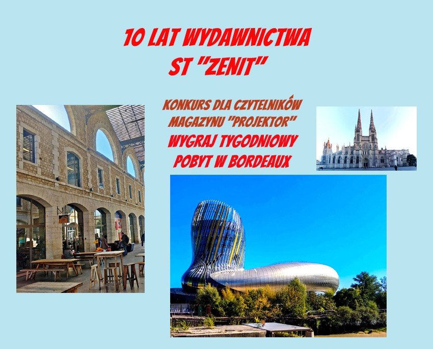 Stowarzyszenie Twórcze Zenit, wydawca m.in. Magazynu Kulturalnego Projektor, z okazji obchodzonego właśnie 10-lecia organizuje konkurs, w którym do wygrania jest tygodniowy pobyt w Bordeaux, w czasie trwania Festiwalu Komiksu Offowego w Angouleme.