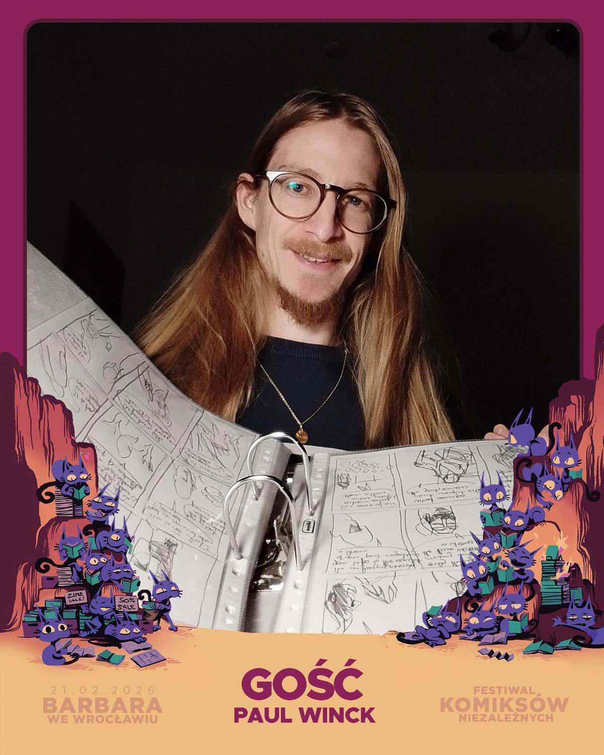Łukasza będziecie mieli okazję posłuchać m.in. podczas panelu Nie solo: kolektywy komiksowe i wspólnoty twórcze, który poprowadzi Marcin Łuczak. - Paul Winck – francuski komiksiarz mieszkający w Berlinie, autor komiksu In Between the Trees wydanego nakładem Moom Comic w 2025 roku. Paul brał udział w innych inicjatywach wydawnictwa, takich jak Damals (2024) i Silence (2024). Poza aktywnością związaną z Moom Comics, jego Prace można podziwiać również w szwajcarskim magazynie Strapazin #159, dla którego wykonał w 2025 ilustrację okładkową, oraz w jego własnym wydawnictwie komiksowym WEIRD stworzonym w 2019, skupiającym się na wydawaniu komiksów awangardowych.