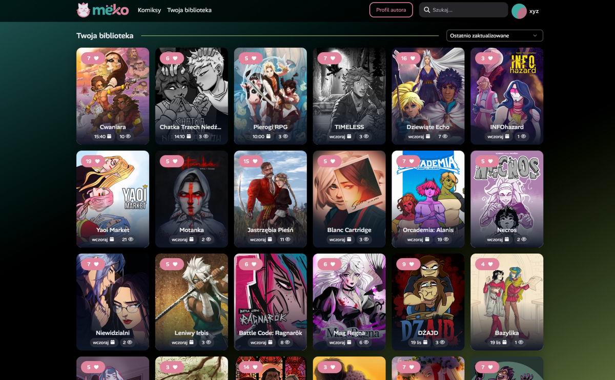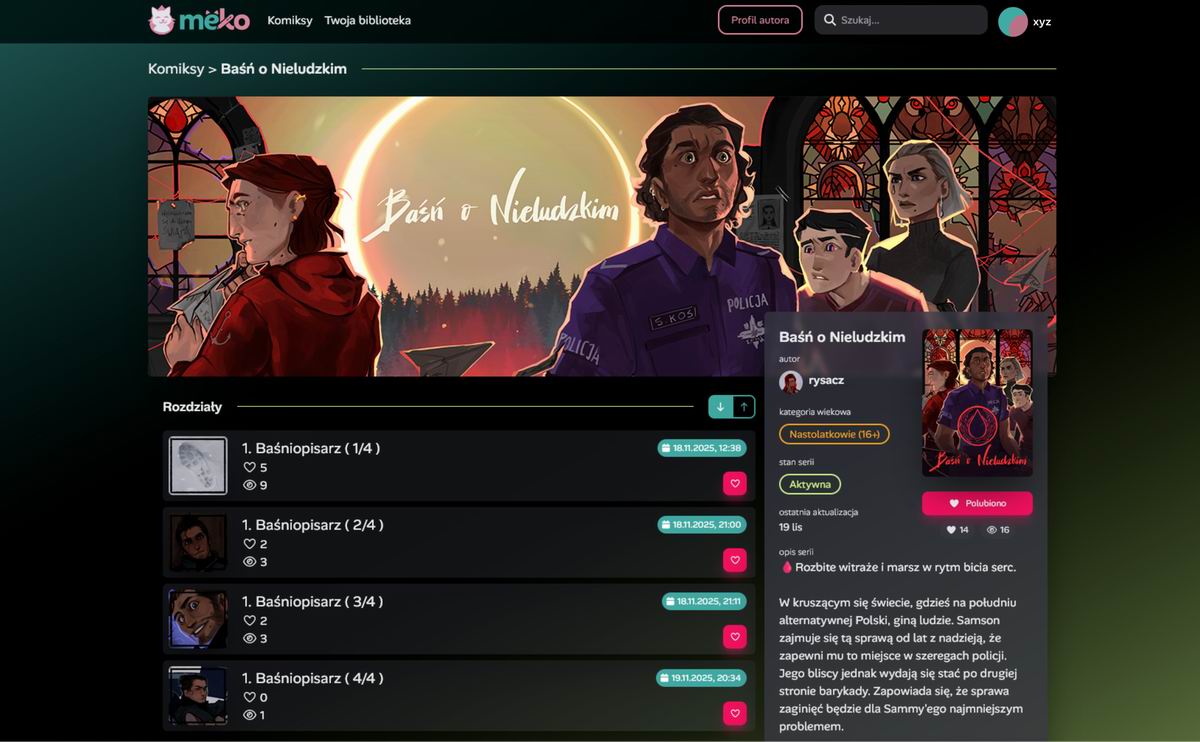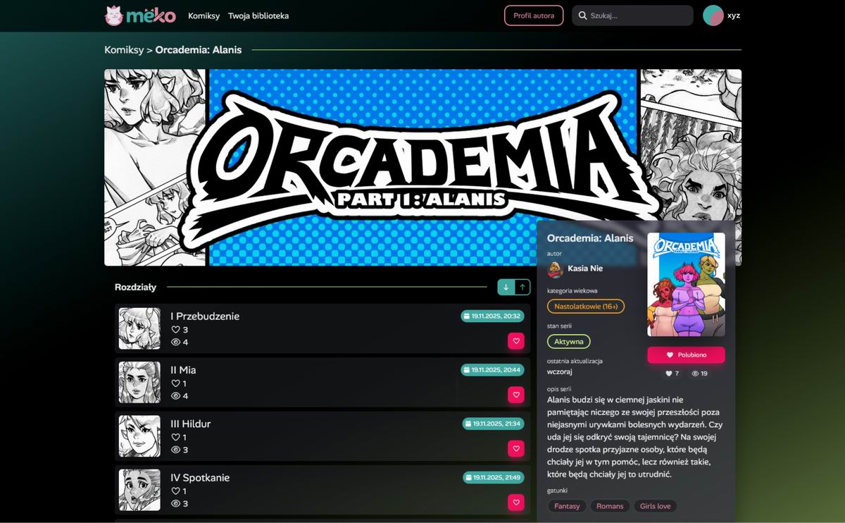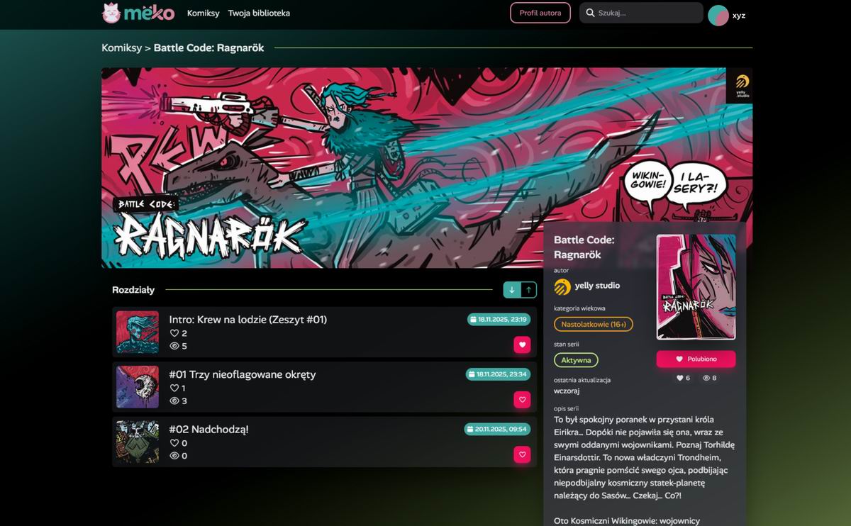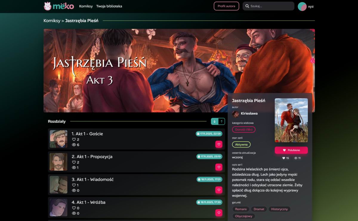 Przypomnijmy: za tą kapitalną inicjatywą stoją Agnieszka „Akaa” Kamieńska, autorka serii Yaoi Market, Paulina „Kiriesława” Obutelewicz, autorka serii Jastrzębia Pieśń oraz Dawid Bińczyk, deweloper i manager. Meko.ink to miejsce, gdzie twórcy i czytelnicy komiksów internetowych ponownie mogą się spotkać, dzielić swoimi historiami i wyrażać siebie. Na chwilę obecną otrzymaliśmy podstawową wersję platformy umożliwiającą publikowanie i czytanie komiksów, ale twórcy systematycznie planują wdrażać sprawdzone rozwiązania z zagranicznych webtoonów.