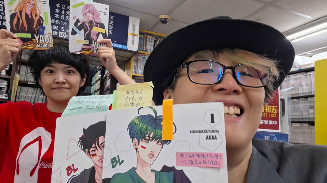 Muszę zaznaczyć, że polskie BL w ogóle nie było znane, więc było to pierwsze zetknięcie tajwańskich czytelników z polskim BL W OGÓLE! Ale niektórzy przychodzili specjalnie, żeby zobaczyć te komiksy, ponieważ promowałam je na moich FB i Threads. Więc wracając do Pana pytania: Czy to spontaniczna dezycja? Tak. Ale gdy to się zaczęło, wszystko było już wyliczone, wykonane z zamysłem: to jak się ubrałam, jak mówiłam do ludzi – jak sprzedawca w sklepie czy w marketingu. Udało mi się nawet promować Yaoi Market na imprezie dla specjalistów, czyli agentów literackich, autorów, wydawców, i też dzięki temu dowiedziałam się, że Węgry i Czechy tez mają BL. Chcę pogłębiać ten temat.