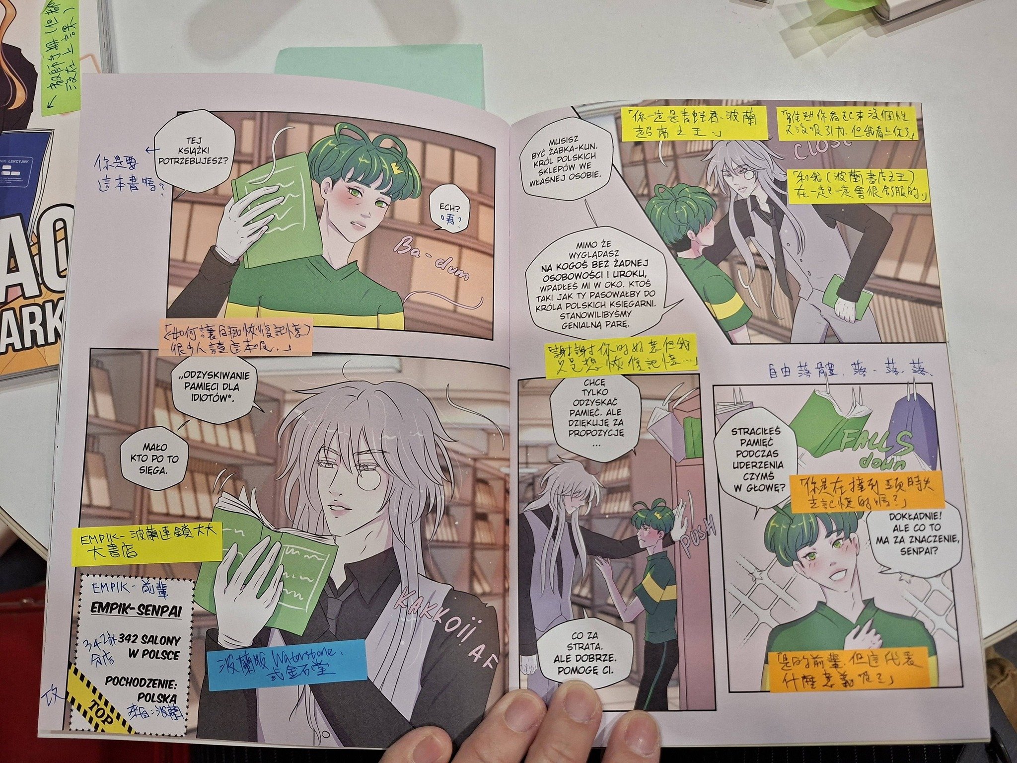 Przywiozłam mu ich dziesięć: głównie fantastykę, ale też ghost stories i historyczne, to są nasze specjalności. Ważyły trzy kilogramy, dźwigałam je najpierw z Warszawy do Gdyni – gdzie biegałam Formoza Challenge – do Torunia, i wreszcie do Gniezna. Pan Koliński był przeszczęśliwy, zaprowadził mnie do Empiku w Gnieźnie, gdzie pokazał polskie komiksy. Zapytałam go wtedy: Czy w Polsce jest gatunek boys love? U nas jest bardzo dużo BL i bardzo dużo czytelników, ale słyszałam, że Polska jest bardziej konserwatywna… I on odpowiedział: Skądże! W komiksie akurat jesteśmy bardzo otwarci!