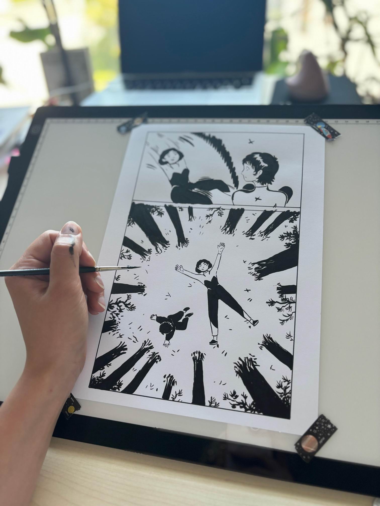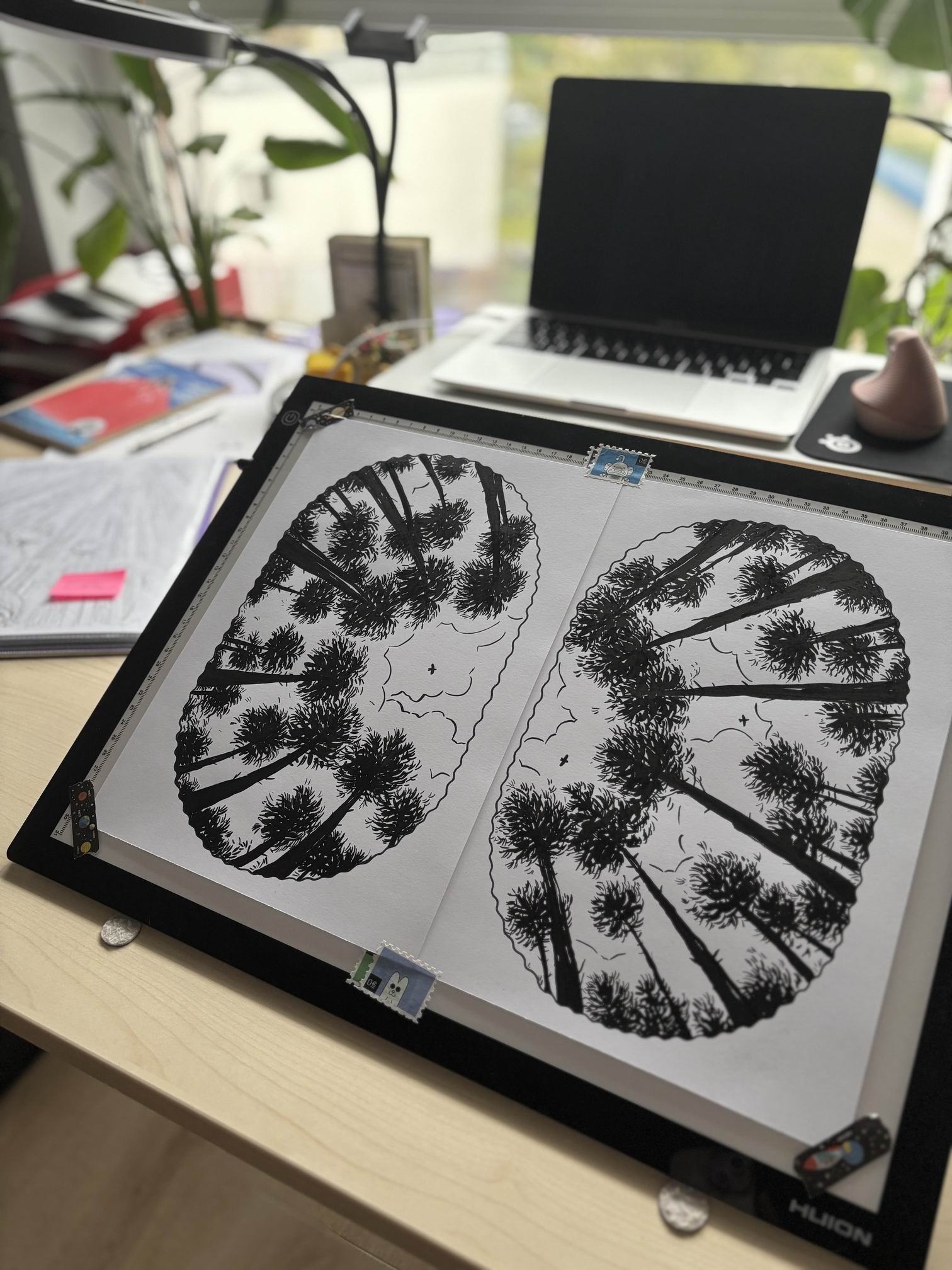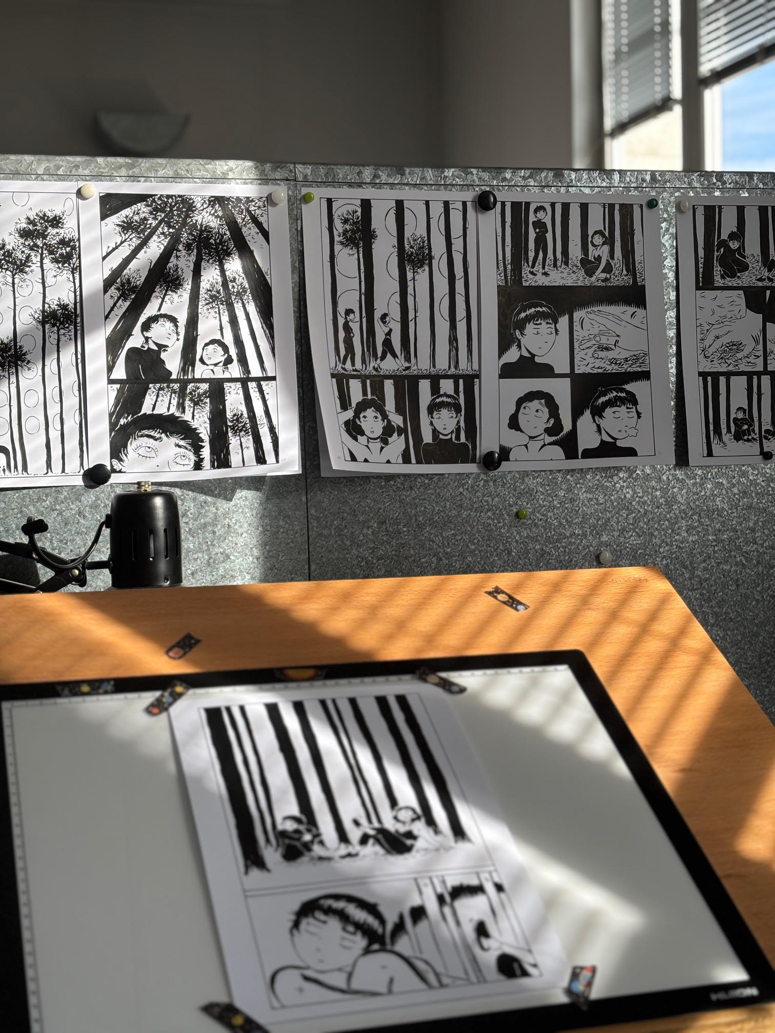 Nad albumem pracuję od lutego. Rysowałam go też na rezydencji w Angoulême. Z planowanych ~240 stron mam już prawie setkę i powoli zaczynam czuć, że ten projekt w mojej głowie przybrał kształt ostateczny. Teraz trzeba go już „tylko” wylać tuszem na papier. Premiery spodziewajcie się w 2027 roku. Albo lepiej się nie spodziewajcie. Nie lubię oczekiwań.