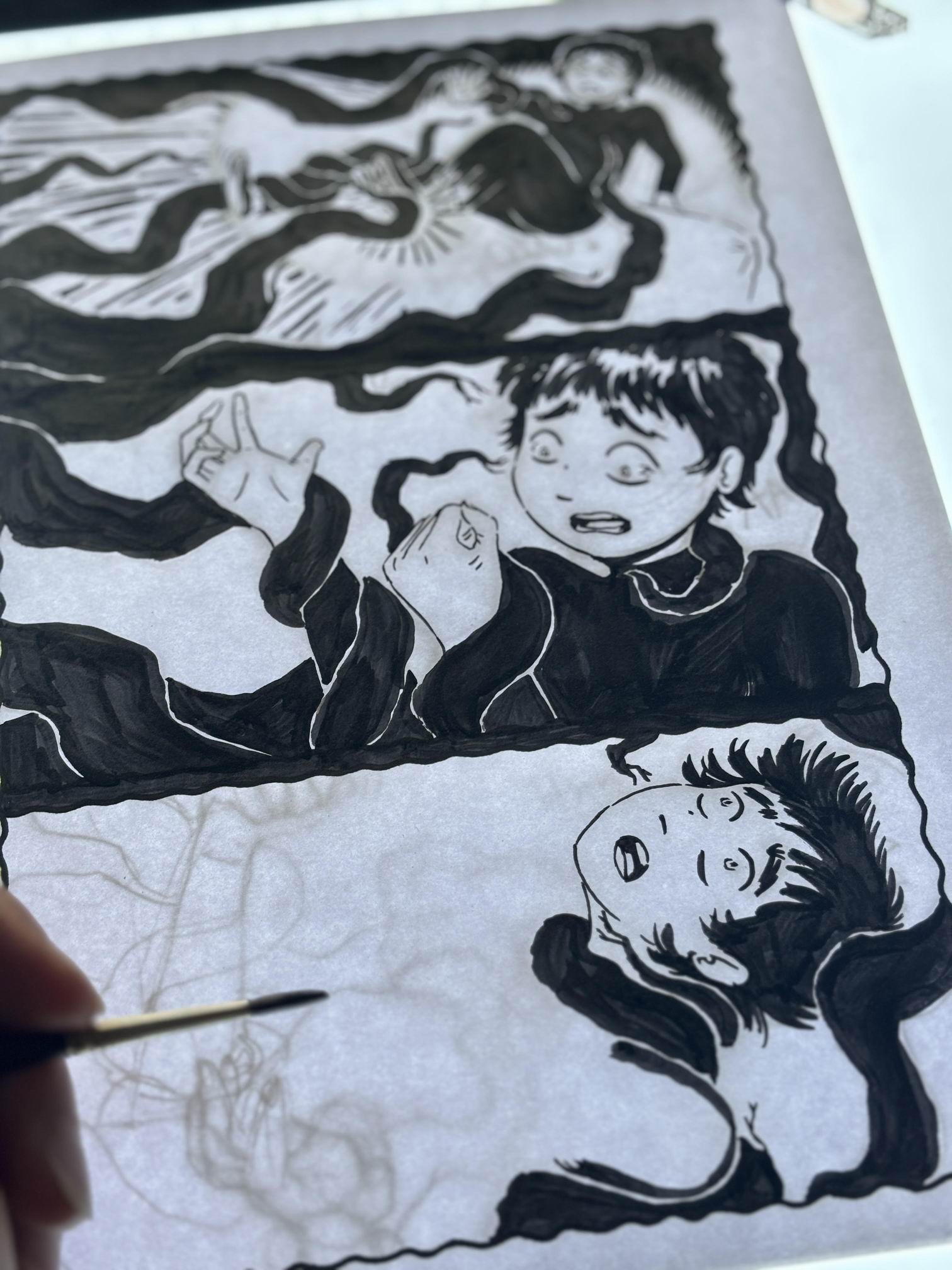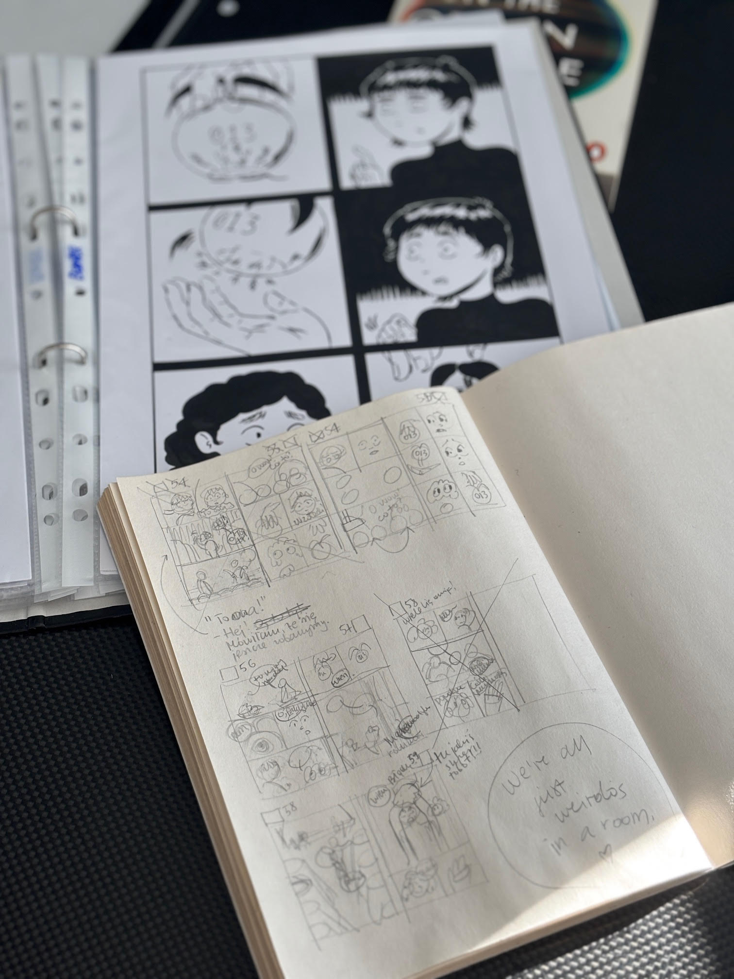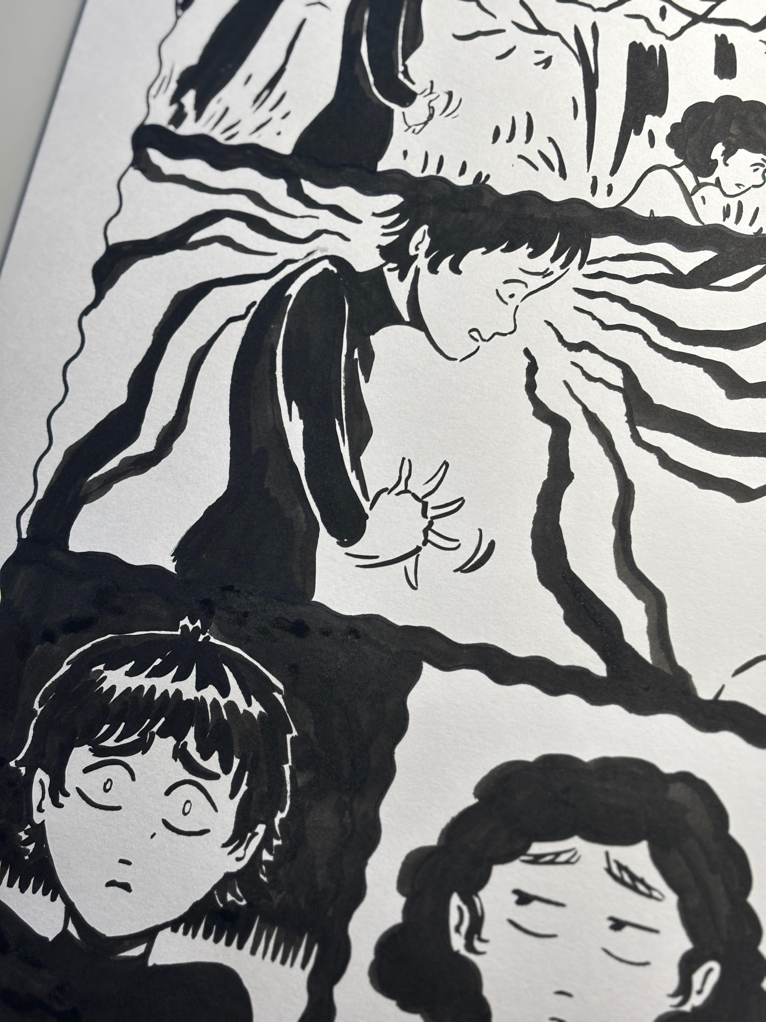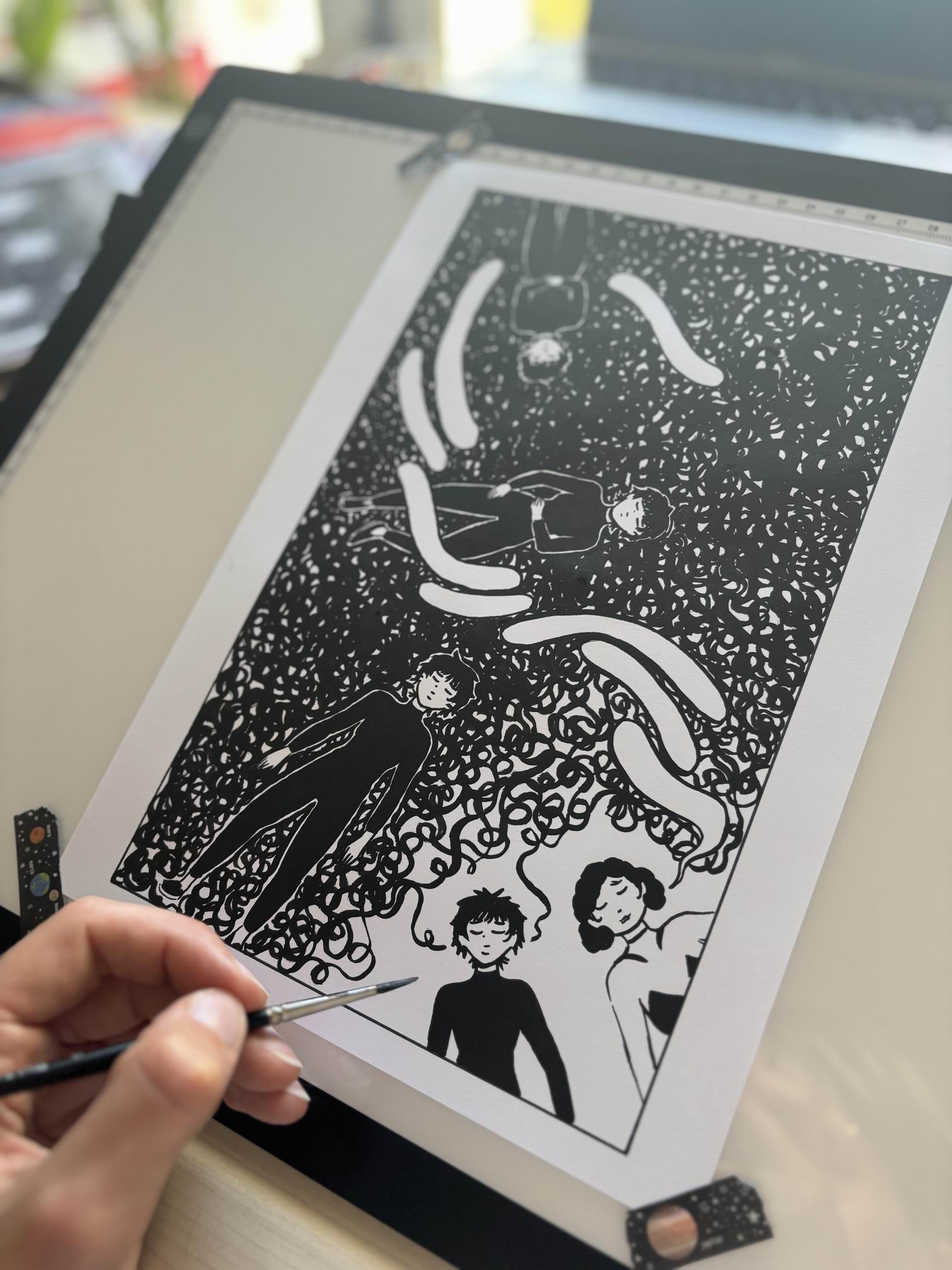 Nad albumem pracuję od lutego. Rysowałam go też na rezydencji w Angoulême. Z planowanych ~240 stron mam już prawie setkę i powoli zaczynam czuć, że ten projekt w mojej głowie przybrał kształt ostateczny. Teraz trzeba go już „tylko” wylać tuszem na papier. Premiery spodziewajcie się w 2027 roku. Albo lepiej się nie spodziewajcie. Nie lubię oczekiwań.