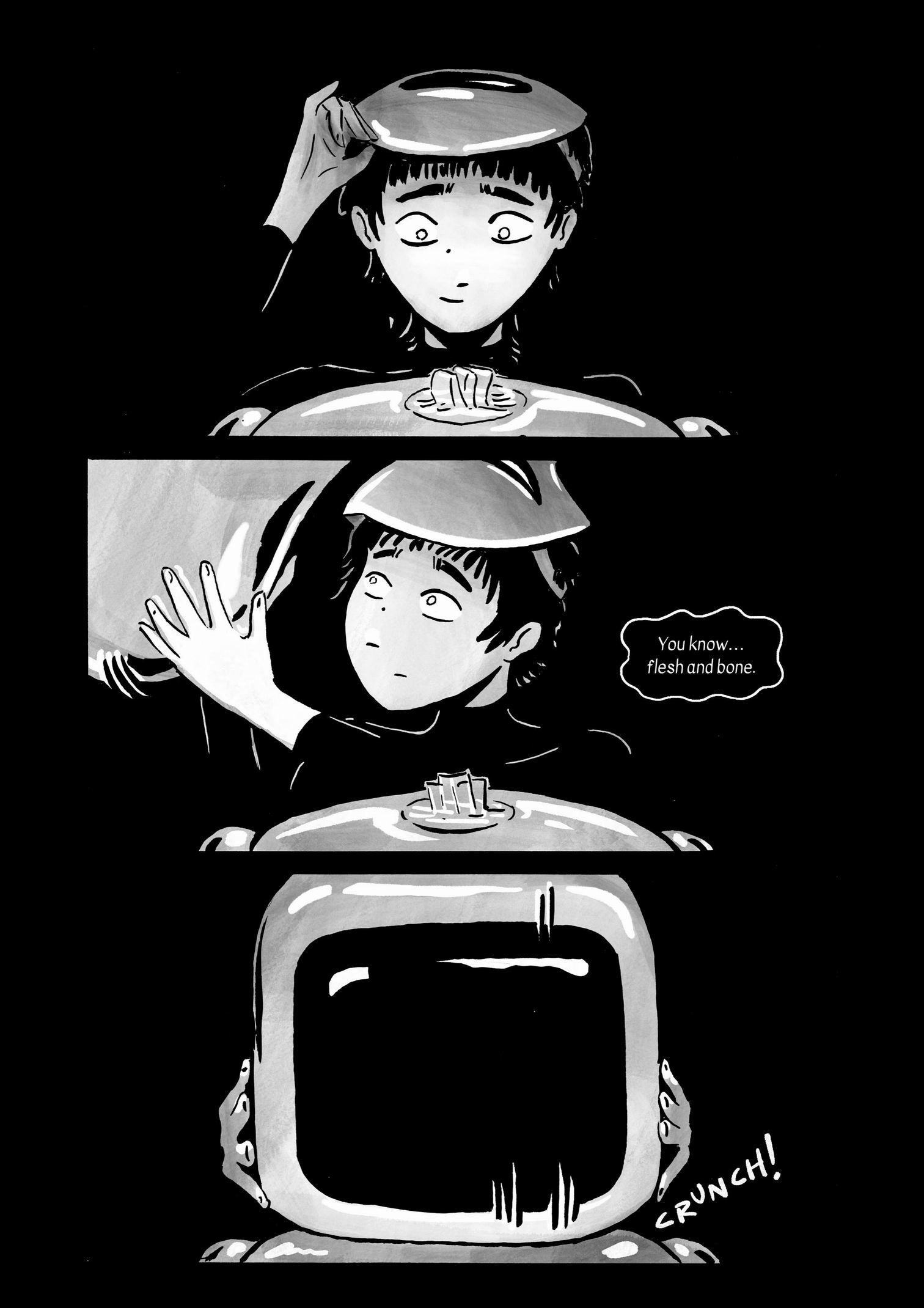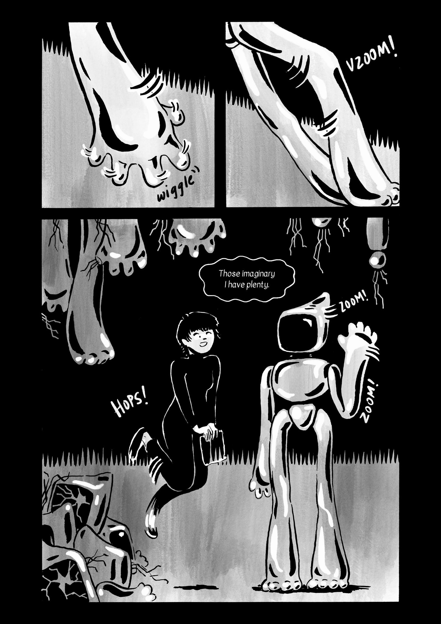 Za wcześnie jeszcze, żeby ujawniać jego tytuł, ale kilka szczegółów odkrywałam już pytana o kolejny projekt. Fabuła dzieje się w dalekiej przyszłości, może nawet za 1000 lat. Zmuszona kryzysem klimatycznym ludzkość zamyka się w wielkich miastach-organizmach, gdzie ma przetrwać aż do momentu odrodzenia się natury. W rygorystycznym społeczeństwie świetnie odnajduje się główna bohaterka komiksu – projektantka robotów Robin. Niestety, mimo iż jest świetna w swojej robocie, ciężko jest jej nawiązywać przyjaźnie i separuje się od reszty społeczeństwa. Aż do dnia, kiedy poznaje dendrolożkę Val, której odmienne spojrzenie na świat wywraca rzeczywistość Robin do góry nogami. Ta z kolei, żeby pomóc sobie w utrzymaniu nowej relacji, postanawia skonstruować robota, który wytłumaczy jej ludzkie emocje.