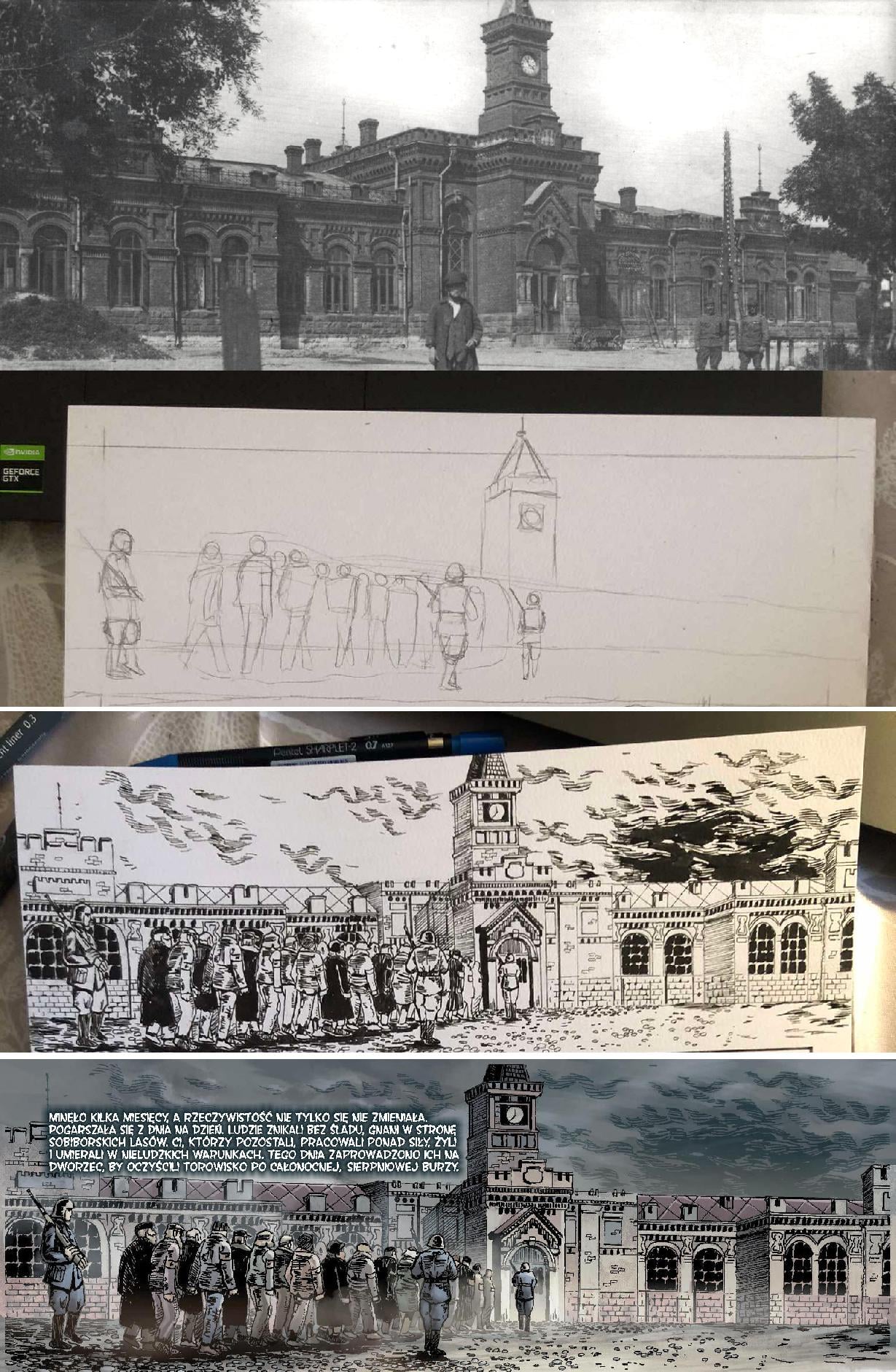 Za kreskę odpowiada Martina Wyżgoł — współautorka pierwszej części. Jej dokładność i sposób patrzenia na detale nadają naszej opowieści niepowtarzalnego stylu, który bardzo zależało mi utrzymać. Martina dostała od nas zestawy zdjęć przyporządkowane do konkretnych kadrów. Na ich podstawie odtwarzała wygląd Chełma z czasu okupacji.