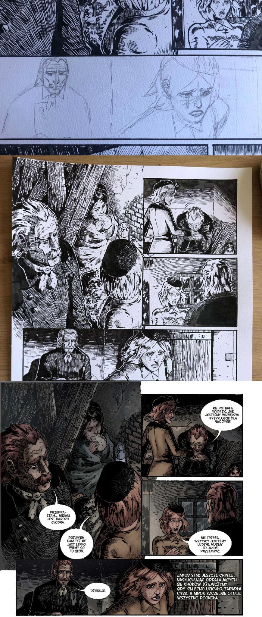 Cała nasza powieść graficzna, więc i rozdział czwarty jest książką po którą sięgną także młodsi czytelnicy. Chciałem, by rozumieli, co się działo, ale żeby nie przeżyli tego w najbardziej brutalnej formie. Dlatego zdecydowałem się usunąć kilka “ciężkich” scen z pierwotnego tekstu — takich jak przesłuchanie przez gestapo. Okrucieństwo wciąż jest obecne, ale poprzez atmosferę, kadry, spojrzenia bohaterów, ciszę. Nie przez dosłowność.