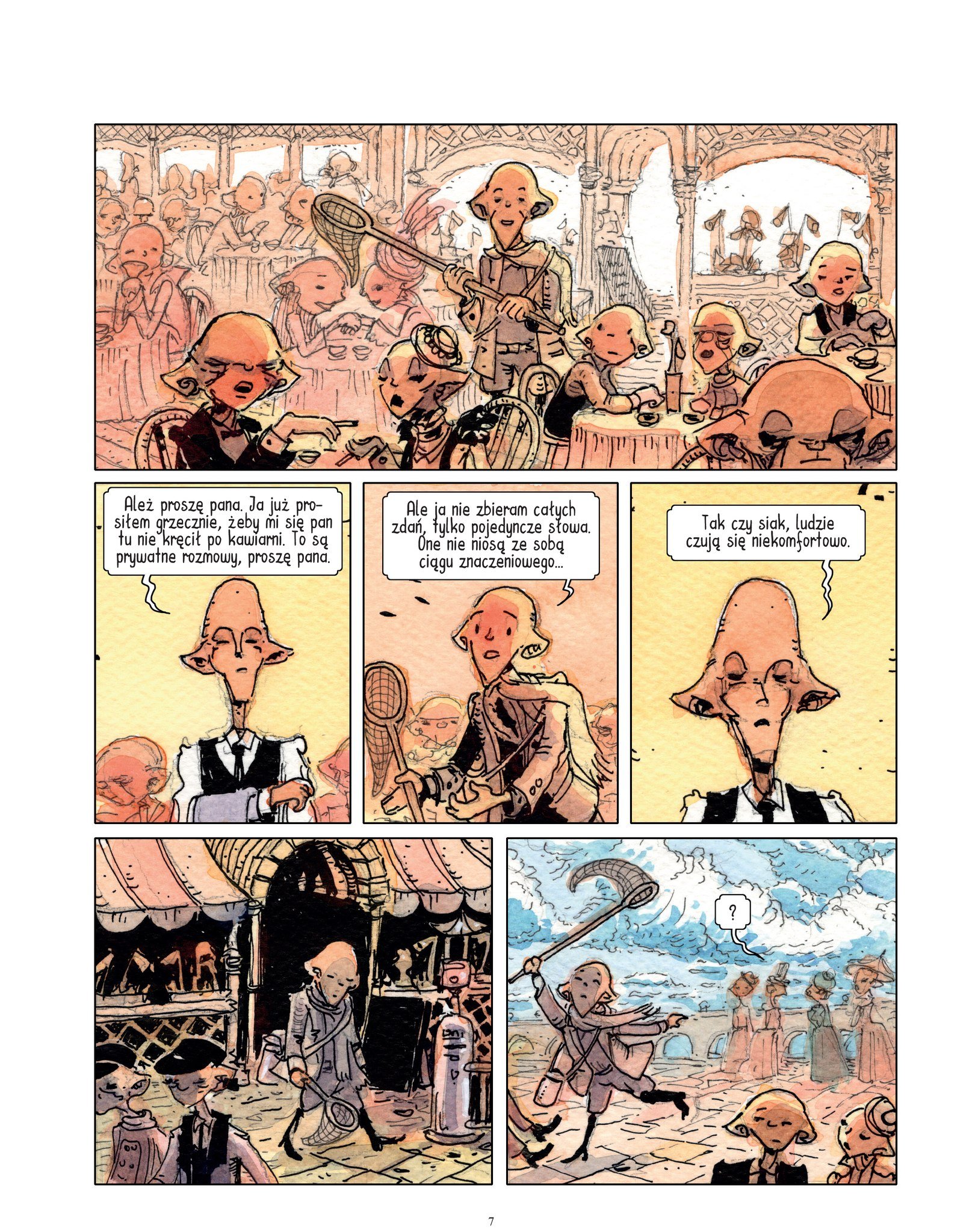 Kolejny szkic, tym razem kolejna wersja ustawienia głównej postaci, jak i próba wejścia w szczegóły ludzi przy stolikach. Możecie zaobserwować w wersji ostatecznej, że te postacie i ich ekspresja pojawia się czasami w tej samej wersji, co tutaj, niekoniecznie w tym samym miejscu, ale na tym polegał ten szkic. Złapać coś, kogoś siedzącego przy stoliku, rozmawiającego, śmiejącego się, piękne dystyngowane panie i tak dalej. Tutaj również mamy zmianę w pozycji kelnera, ponieważ tutaj ta okładka zaczyna powoli opowiadać swoją historię.