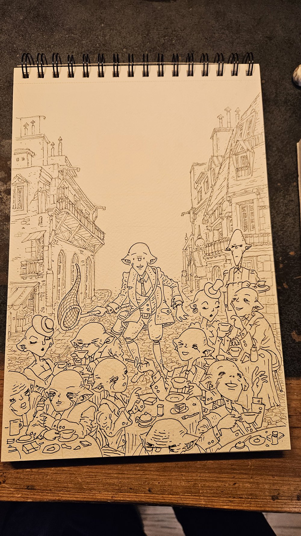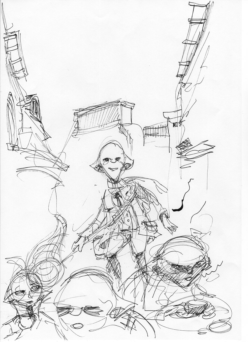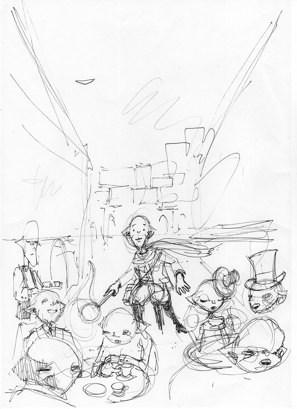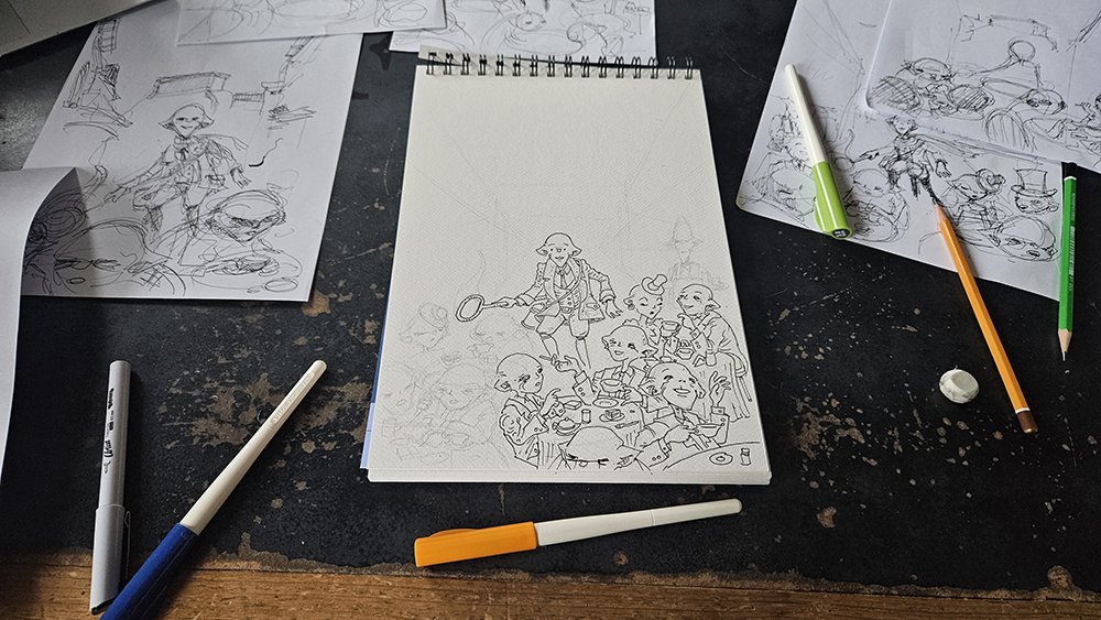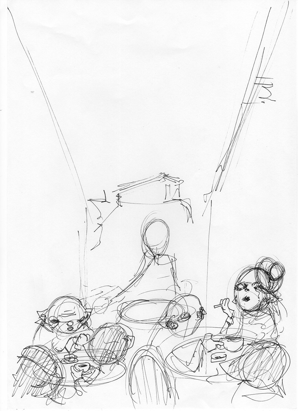 Kolejny szkic, jeden horyzont, próba dopasowania całej sceny do jednej rzeczywistości perspektywicznej. Horyzont jest ustawiony na poziomie oczu głównej postaci albumu, podkreślając wagę tego elementu. Teraz postaci rzeczywiście zaczynają wyglądać, jakby siedziały przy stolikach na wąskiej, paryskiej uliczce.