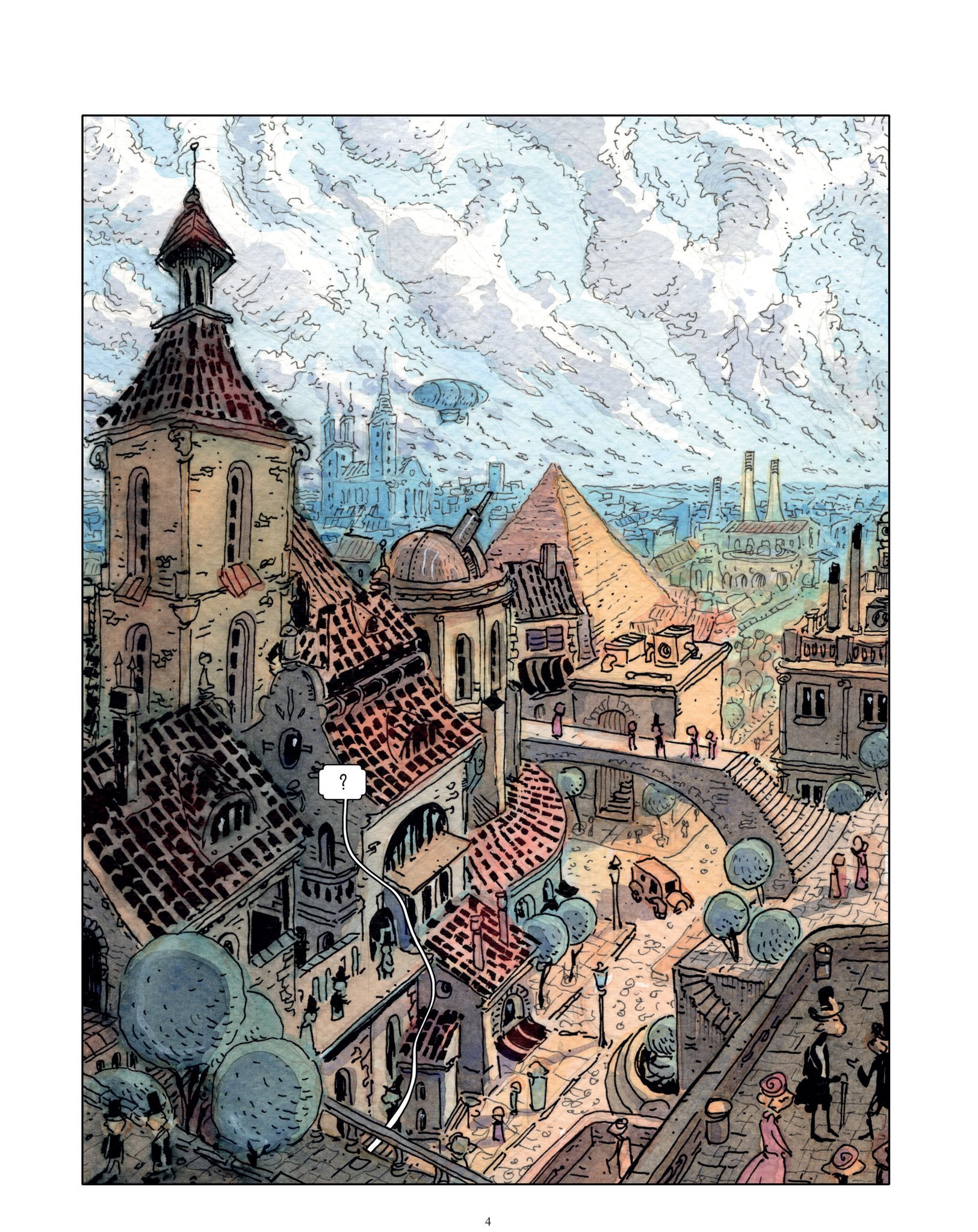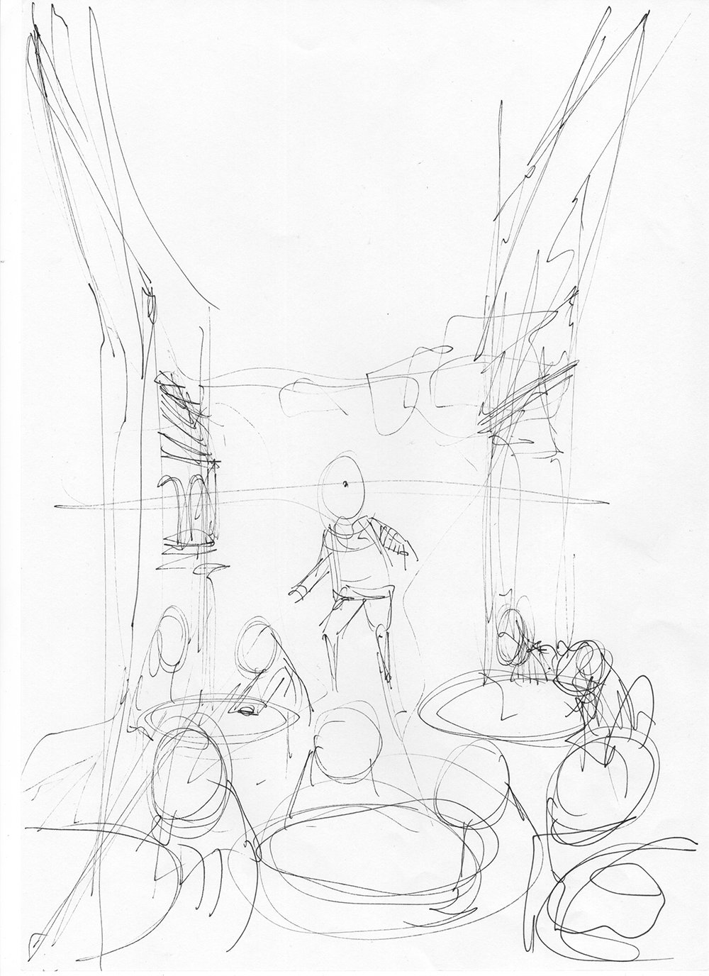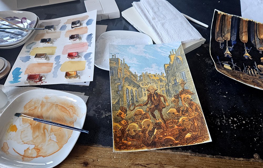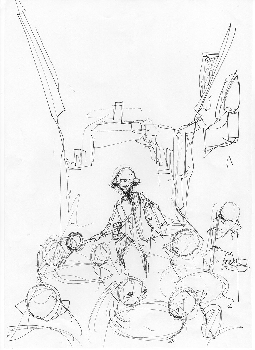 Kolejny szkic, jeden horyzont, próba dopasowania całej sceny do jednej rzeczywistości perspektywicznej. Horyzont jest ustawiony na poziomie oczu głównej postaci albumu, podkreślając wagę tego elementu. Teraz postaci rzeczywiście zaczynają wyglądać, jakby siedziały przy stolikach na wąskiej, paryskiej uliczce.
