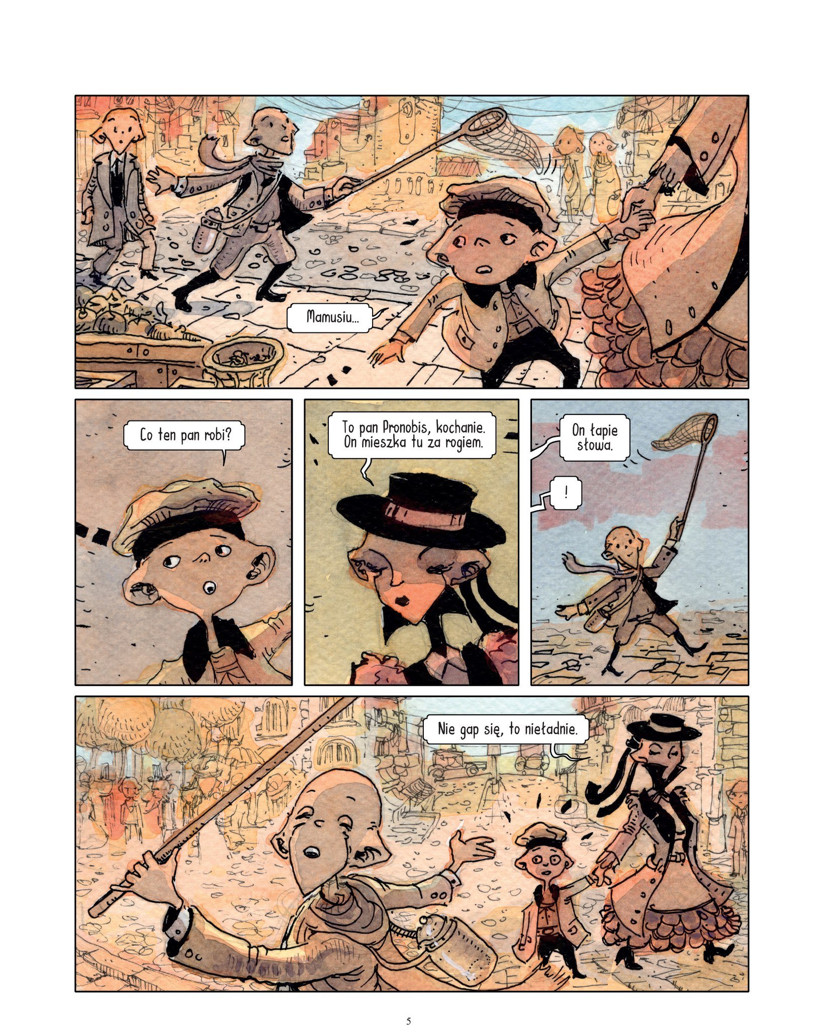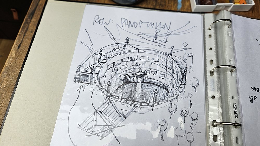 Trzeci plan jest już tylko narysowany ołówkiem, w sumie przygotowany do tego, by trochę zaginąć pod akwarelą, żeby złapać delikatne poczucie perspektywy powietrznej pomiędzy postaciami a ulicą z tyłu.