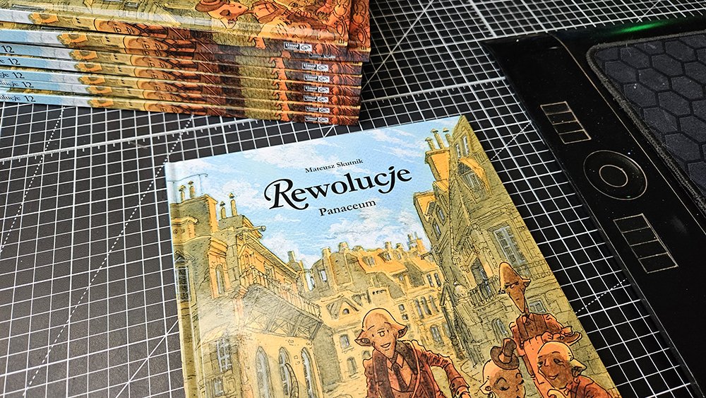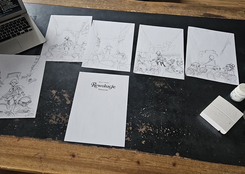 „Rewolucje 12: Panaceum”, wydawca jak zawsze Timof Comics, oficjalna premiera na festiwalu komiksowym w Poznaniu.Pokażę wam mój proces tworzenia najtrudniejszego dla mnie osobiście elementu każdego albumu, czyli okładki. Tak samo, jak przy każdym zmywaniu na koniec dopada cię jeszcze realizacja o treści „o w mordę, jeszcze patelnia…”, tak samo dla mnie na koniec albumu jest to „o w mordę, jeszcze okładka…”.
