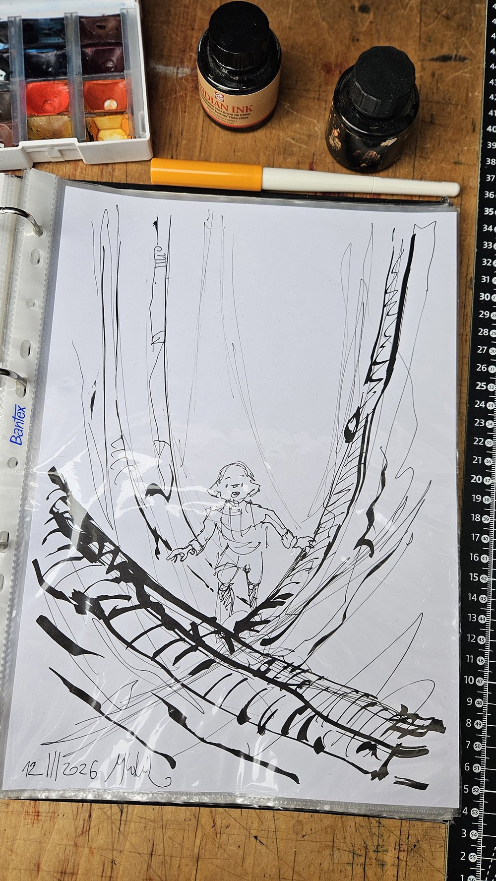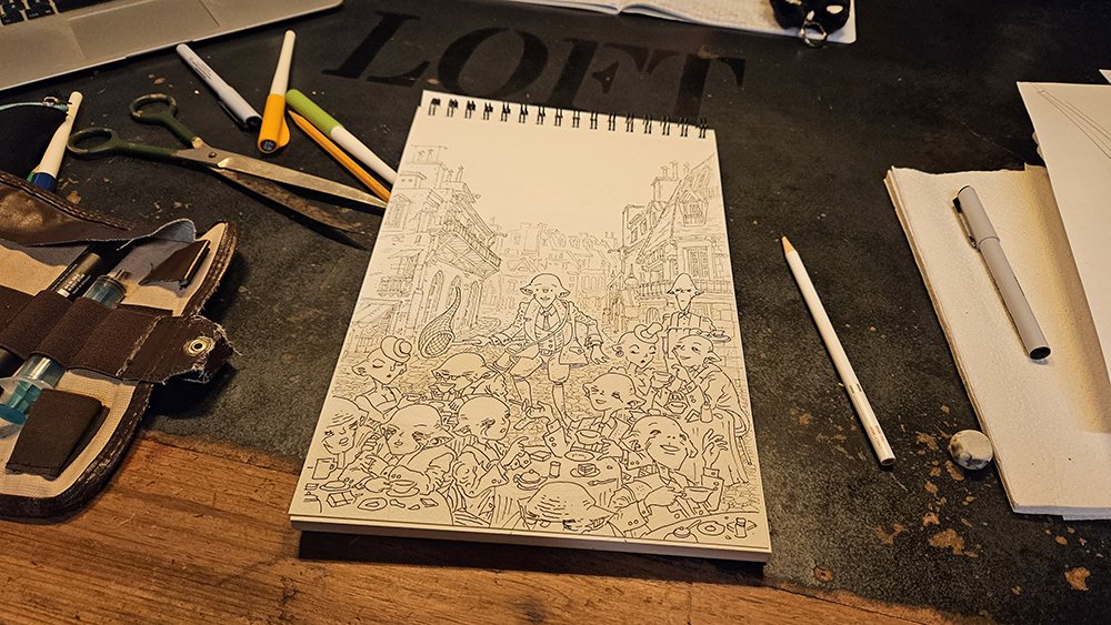 Po naszkicowaniu pierwszego planu przechodzimy do tuszu, pamiętając, że mamy tutaj tak naprawdę trzy plany. Pierwszy, to wszystkie postaci. Od tego tutaj zaczynam. Zwróćcie uwagę, że podczas szkicowania mam dookoła wszystkie szkice do wglądu, wyciągając z każdego po trochu wedle uznania i zasług poszczególnych szkiców. Z jednego perspektywa, z drugiego główna postać, z kolejnych ludzie przy stolikach i tak dalej.