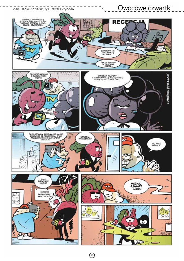 Natomiast kolejny duet autorów – Daniel Koziarski i Paweł Przygoda dostarczył do numeru humorystyczne Owocowe czwartki. Dominik Szcześniak swoimi Xerospekcjami wspomina czasy prasy kserowanej i zina KGB Huberta Ronka. Także i ten niesamowicie pracowity autor gości na łamach czterdziestki i to w dwóch odsłonach. Komiksowo, epizodem z jego serii W.E. oraz w części publicystycznej, w wywiadzie, który przeprowadził Daniel Gizicki.