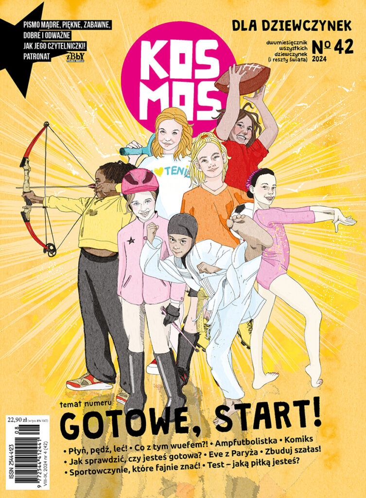 Gotowe, start! – to rozpędzony numer, pełen energii, radości i słońca. Dla dziewczyn, które kochają ruch w każdej odsłonie albo szukają aktywności dla siebie. Piłka nożna, gra we frisbee, pływanie w jeziorze, a może włóczenie się po krzakach? „Kosmos dla dziewczynek” zachęca, by robić wszystko to, co sprawia frajdę! A przy okazji zastanawia się nad tym, jak to się dzieje, że wiele dziewczyn kocha sport, a nie lubi szkolnego WF-u. I co właściwie można (a nawet trzeba!) z tym zrobić.
