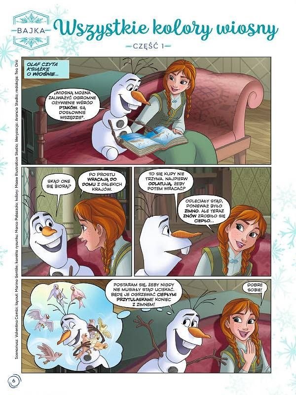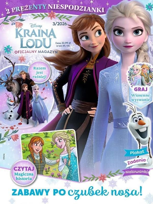 W magazynie czytelniczki mogą dołączyć do bohaterów poznanych w filmie i śledzić ich zupełnie nowe przygody. Nie zabraknie uroczego bałwanka Olafa, pomocnego Kristoffa i przezabawnego renifera Svena. Poprowadzą oni czytelników przez historie komiksowe umieszczone na stronach pisma, zagadki i kolorowanki.