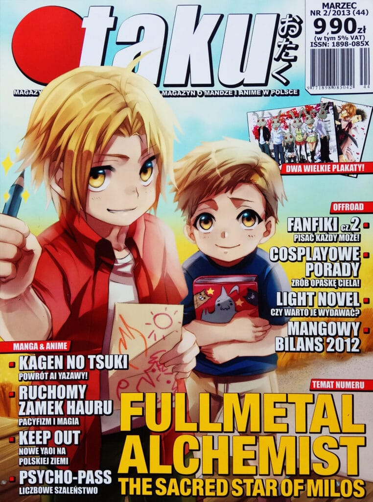 A oto i 44. numer „Otaku”. W środku czekają na Was jak zawsze ciekawe recenzje, m.in. takich tytułów jak „Fullmetal Alchemist: The Sacred Star of Milos”, „Psycho-pass” czy „Ruchomy zamek Hauru”. Nie zabraknie też tekstów poświęconym mangom wydanym w Polsce tj. 1-tomowemu yaoi „Keep Out” oraz serii „Kagen no Tsuki” autorstwa Ai Yazawy. Spełniliśmy też Wasze prośby i powiększyliśmy dział offroad – tym razem podsumujemy mangowy 2012 rok, wrócimy do tematu pisania faników, opiszemy aferę pewnego zdjęcia oraz pokażemy Wam jak zrobić opaskę Ciela. Prócz tego, przyszykowaliśmy też dla Was konkurs, w którym do wygrania będą fiszki do nauki języka japońskiego. W numerze dodatkowo dwa duże plakaty. Plakat z serii „Doubt” oraz „Keep Out”.