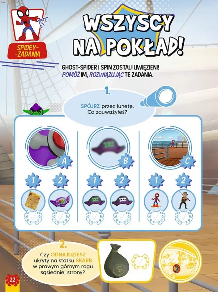 Magazyn „Spidey i Superkumple” jest pełen specjalnie opracowanych zadań wspomagających rozwój małych superbohaterów, takich jak ćwiczenie i rozpoznawania liter, cyfr oraz kolorów. Dziecko uczy się nowych rzeczy i odkrywa różne ciekawostki poprzez zabawę, a także ćwiczy myślenie logiczne i doskonali swoje umiejętności poprzez przygotowane testy supermocy!