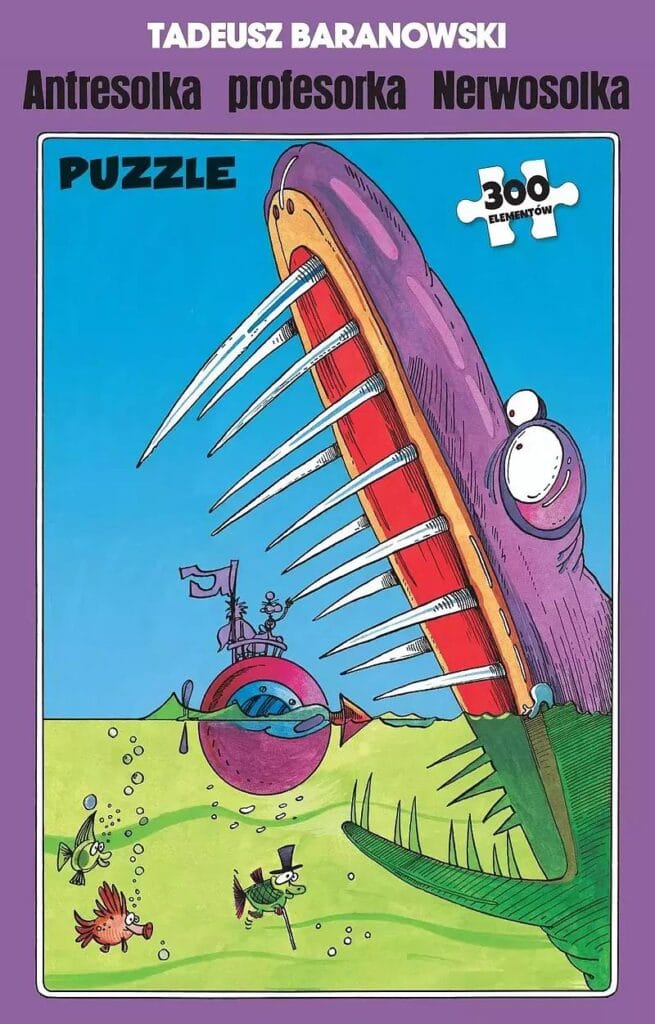 Puzzle z ilustracją z komiksu „Antresolka profesorka Nerwosolka”. Do układanki dołączony jest plakat ułatwiający złożenie.