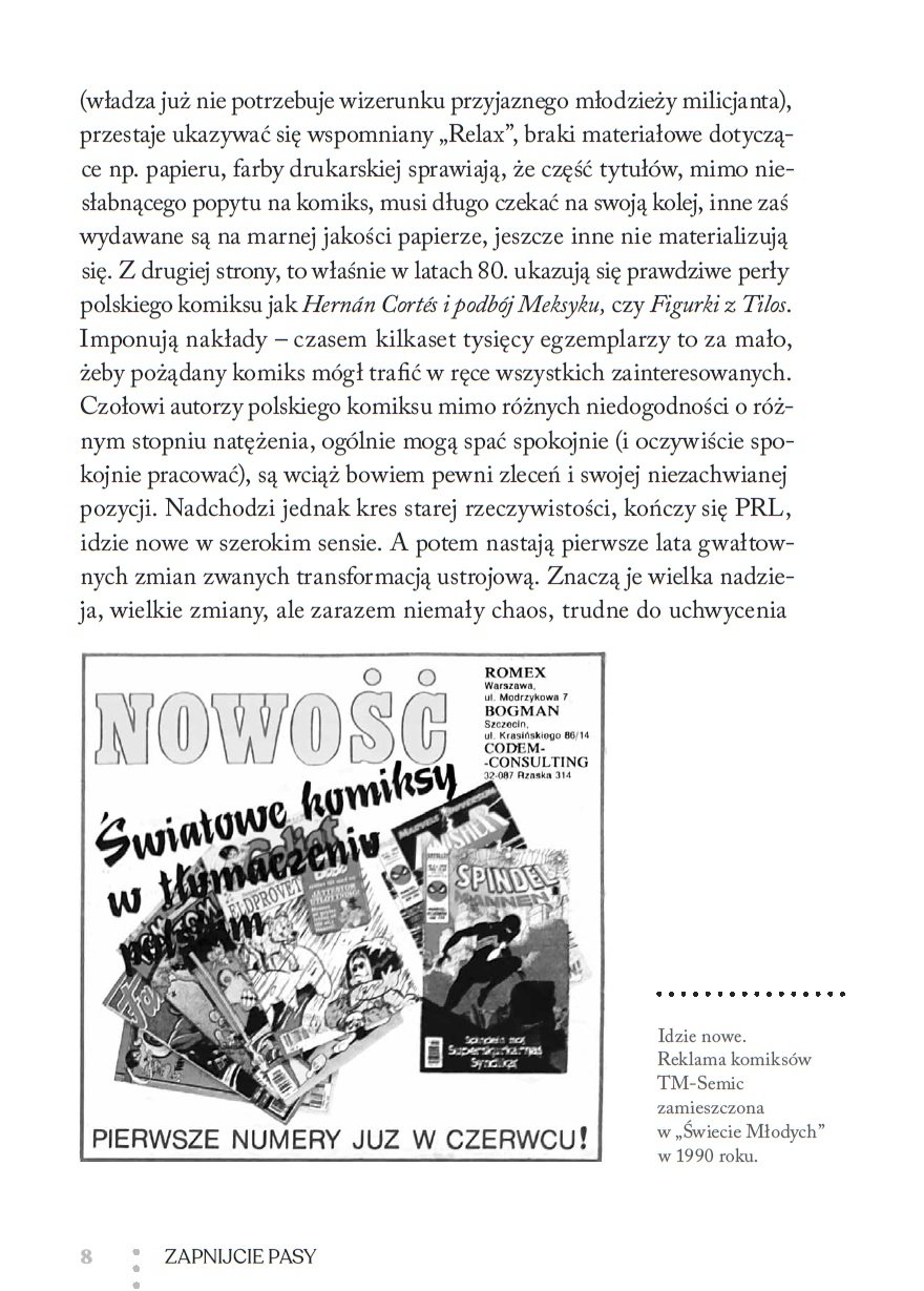 Nowe, efemeryczne wydawnictwa drukują szybko i co popadnie, uznanych twórców, debiutantów i amatorów. Sprowadzają do Polski nieznane wcześniej komiksy z Zachodu. Jest to czas niezwykle barwny, dynamiczny i pełen kontrastów. Ukazują się legalnie i profesjonalnie przygotowane komiksy oraz pirackie przedruki i wydawnicze kurioza. Ułomnie przetłumaczone, źle wydrukowane czy po prostu urągające poziomem były świadectwem czasów. Dziś spora część z nich uległa zapomnieniu. I właśnie o nich traktuje książka.