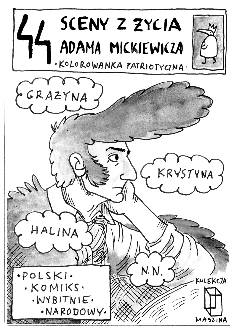 Adam Mickiewicz (1798 – 1855) to najwybitniejszy polski poeta, ale też działacz polityczny i wojskowy, publicysta, tłumacz, redaktor, filomata, prekursor, mistyk, ojciec. Wielki romantyk, tak jak – w głębi serca – każdy z nas. Przez większość życia był bardzo przystojnym mężczyzną, natomiast przez pozostałą resztę – bardzo ładnym dzieckiem. Z wyglądu przypominał trochę Redforda, ale miał zdecydowanie lepszą cerę. Zawsze mówił to, co myśli i starał się myśleć to, co mówił. Miał mnóstwo kolegów i jeszcze więcej koleżanek.