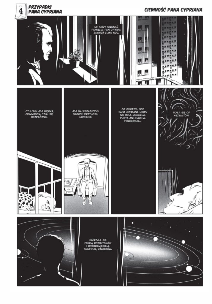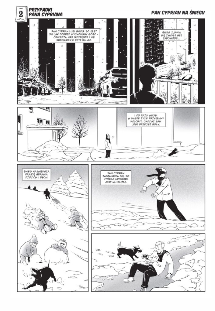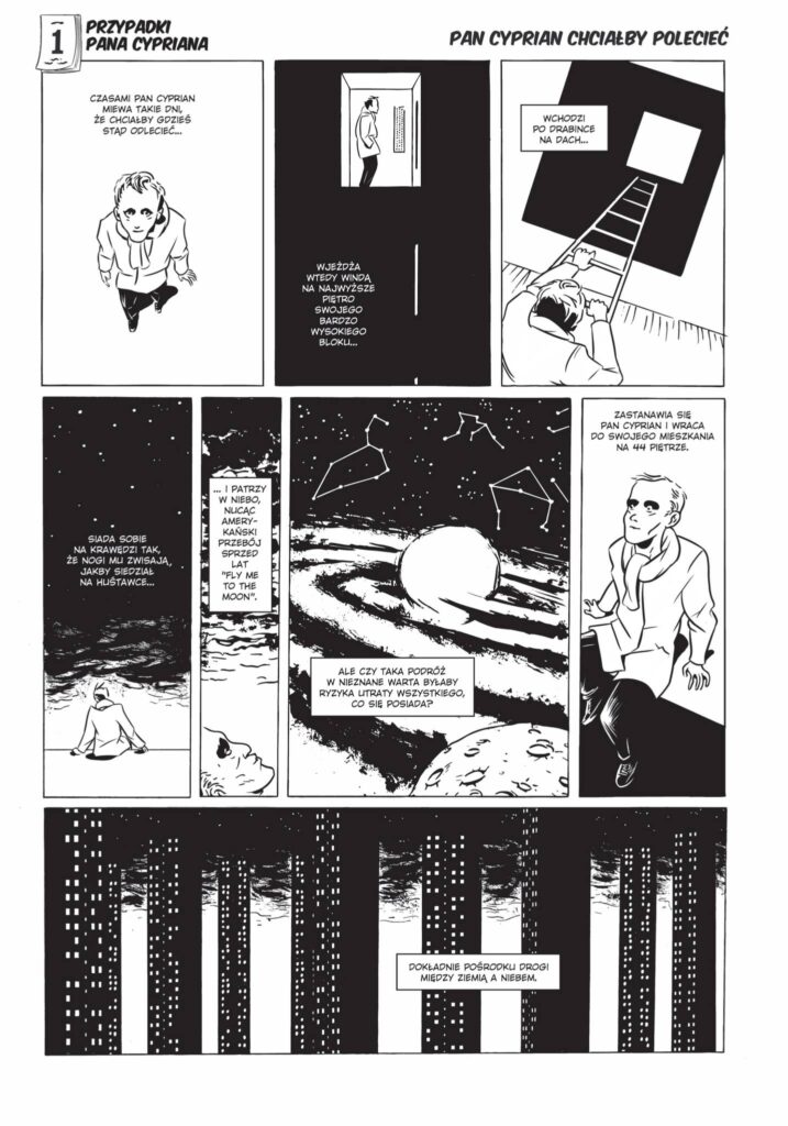 Pan Cyprian to mężczyzna w stosownym wieku, który przeszedł już smugę cienia; mieszka w dużym mieście na 44 piętrze („dokładnie pośrodku drogi między ziemią a niebem”) bloku z wielkiej płyty; jest samotnikiem, ale ma wiernego przyjaciela – psa o imieniu Pedro.