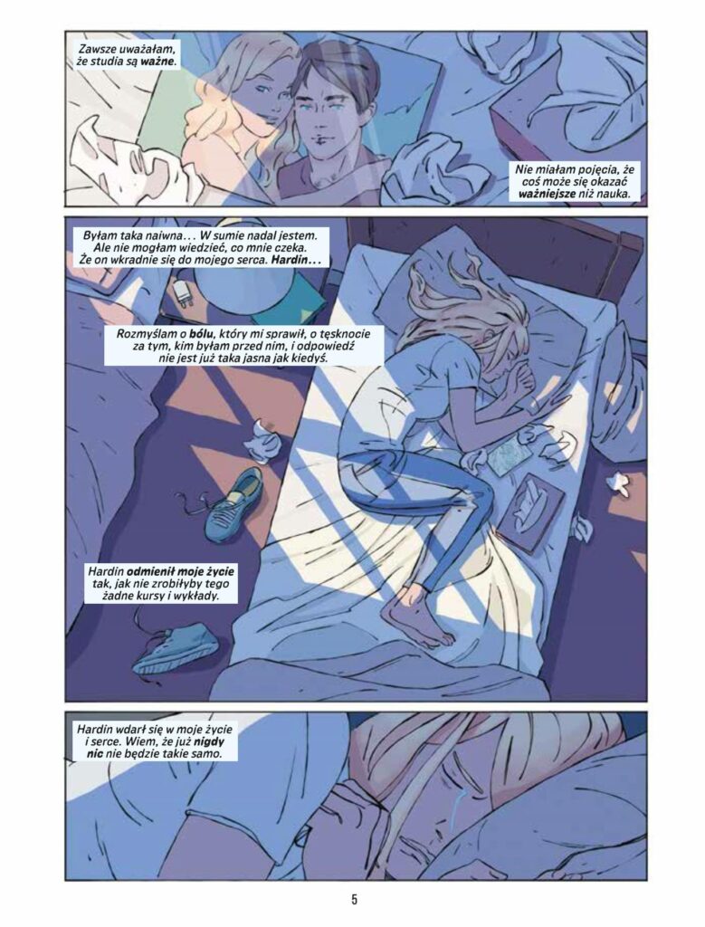 Każde spotkanie z Hardinem sieje coraz większy zamęt w sercu dziewczyny i budzi w niej pragnienia, jakich dotąd nie znała. Empatyczna i wrażliwa Tessa coraz częściej dostrzega w Hardinie skrzywdzoną, zdolną do wielkiej miłości osobę. Jednocześnie chłopak zaczyna ujawniać też przed nią swoją ciemną stronę… Czy niespodziewany wybuch namiętności okaże się dla Tessy wyzwoleniem, czy też zburzy jedynie w gruzy całe jej dotychczasowe życie?