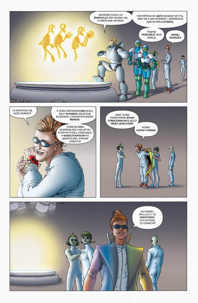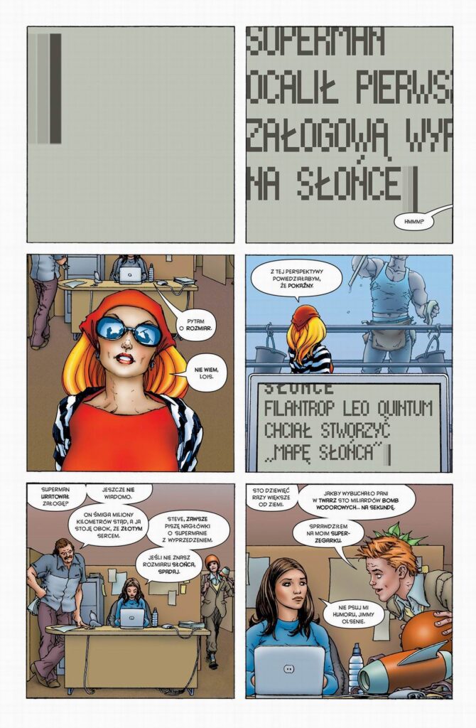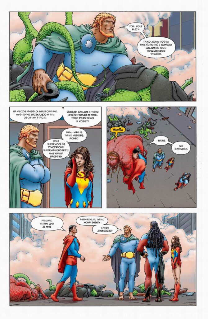 Frank Quitely, znany ze swojego charakterystycznego, nadmiarowego stylu daje na dużych kadrach mnóstwo oddechu i mnóstwo przestrzeni, tak by sylwetka jego zwalistego Supermana nie przysłoniła tych najważniejszych momentów. Razem z Morrisonem buduje opowieść zbudowaną na kontrastach, choćby na kontraście między uroczo gapowatym i rozlazłym Clarkiem Kentem i gotowym na wszystko, posagowym Supermanem. Jednak najważniejszy w tej historii jest świetnie uchwycony kontrast między tym, co reprezentuje Lex Luthor i z przeciwnej strony tytułowy bohater. To zostało również uchwycone w filmie Jamesa Gunna, choć tam Superman jest jeszcze nieopierzony, natomiast w opowieści Morrisona to postać dojrzała i świadoma przede wszystkim swojej odpowiedzialności za całą planetę.