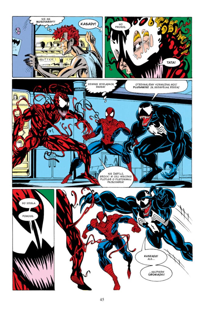 Gdy psychopata Cletus Kasady dzięki potomkowi Venoma staje się symbiotycznym seryjnym zabójcą, Peter Parker podejmuje najtrudniejszą decyzję w życiu – prosi Venoma o pomoc! Czy Eddie Brock stanie po jego stronie, czy też nic go nie odwiedzie od zamiaru zniszczenia Spider-Mana? Dodatkowo: Spider-Man wkracza do leża Lizarda oraz stawia czoło potężnemu przeciwnikowi u boku drużyny New Warriors! Czy prześladowany przez ducha Kravena Łowcy Pająk ocali duszę jednego ze swoich najgroźniejszych wrogów? Nastąpi też niespodziewany powrót dwojga postaci, który zmusi Spider-Mana do bliższego przyjrzenia się bolesnemu fragmentowi jego przeszłości… o ile wcześniej upora się z Taskmasterem i Red Skullem!