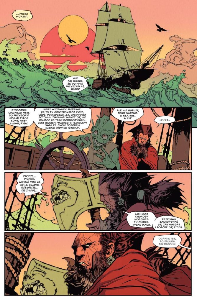 Album otwierający serię, zawierający trzy pierwsze zeszyty, pozwala nam poznać częściowo świat przedstawiony (nie oszukujmy się, mocno generyczny w konwencji heroic fantasy), ale też główne postaci, wraz z ich ponuro – ironiczną genezą. No i niespodziewanego kompana (kompankę?) jaką niechcący zjedna sobie nasz barbarzyńca. Bo co to za fantasy, bez drużyny, choćby i skromnej, prawda?