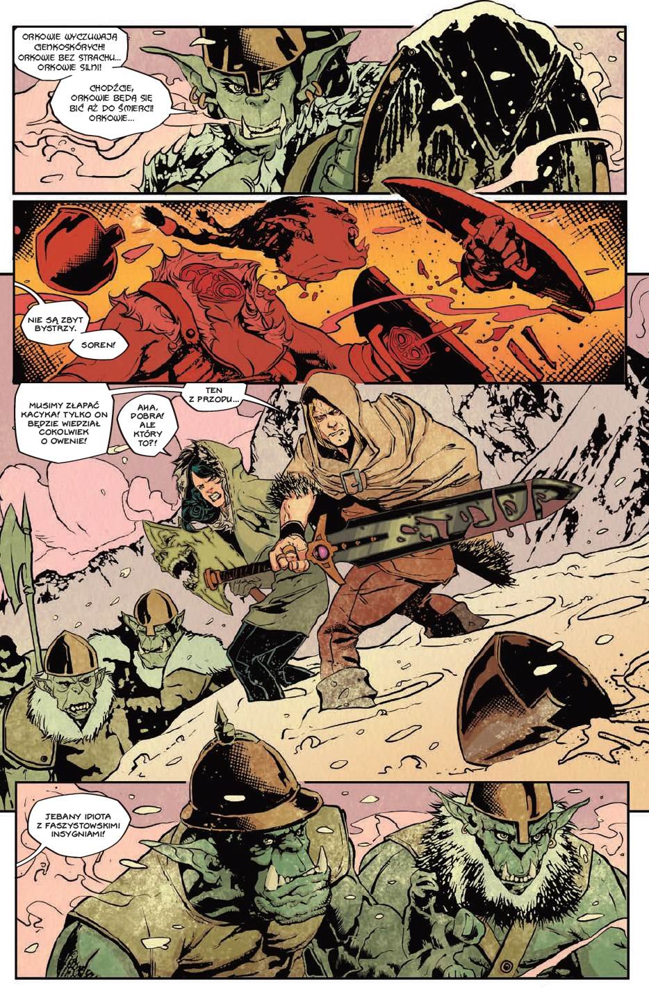 Mnóstwo tutaj pastiszowego humoru, mnóstwo ironizowania ze schematów podejmowanej konwencji i całość fabuły raczej prowadzona z przymrużeniem oka, na zasadzie – ale to wszystko już gdzieś było. Tylko że już w wykonaniu detali, jest całkiem na serio. Jest solidnie pomyślana główna postać, jest niespodziewana towarzyszka, jest magiczny oręż i pojawia się nawet arcywróg na horyzoncie. Prawdziwa jest też krew (a jest jej dużo), całkiem na serio jest sieczka, jaką robi toporem Owen Barbarzyńca. I jest masa całkiem niesympatycznych stworów, tak ludzkiego, jak i pośledniejszego, gobliniego czy tam demonicznego pochodzenia.