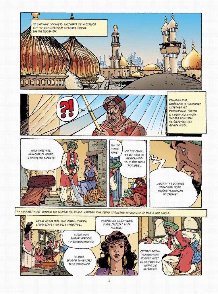„Baśnie 1001 nocy” (znane także jako „Księga tysiąca i jednej nocy” i „Tysiąc i jedna noc”) są zbiorem opowieści opartych na dawnych baśniach, podaniach i legendach arabskich, perskich, staroindyjskich i babilońsko-asyryjskich. Są to niezależne od siebie utwory spięte w całość przez legendę o sułtanie Szahrijarze i jego żonie Szeherezadzie. Okrutny sułtan, przekonany o niewierności kobiet, każdą ze swoich żon każe zabić natychmiast po nocy poślubnej. Aby uniknąć tego losu Szeherezada rozpoczyna każdej nocy tak pasjonującą opowieść, że sułtan pragnie poznać jej zakończenie i odkłada wykonanie wyroku. Zaliczane do arcydzieł literatury światowej „Baśnie” powstały w IX–X w. Były odbiciem wyobrażeń prostych ludzi na temat życia sfer wyższych, dlatego często zawierają naiwne i pełne przesady opisy ich życia. Autorem komiksowej adaptacji tego dzieła jest francuski scenarzysta Daniel Bardet (zm. w 2022 roku), znany z innych albumów serii Adaptacje literatury („Nędznicy”, „Baśnie 1001 nocy”), zaś rysunki wykonał Rachid Nawa („Journal de Mickey”).