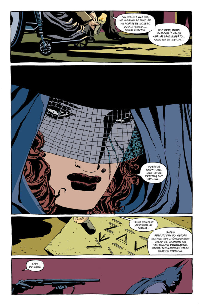 Tak, jak „Długie Halloween”, tak i „Mroczne zwycięstwo” to kwintesencja tego, czym winien charakteryzować się Batman. Jest więc smoliście czarny klimat noir, są zbrodnie i do bólu uczciwi policjanci, którzy próbują im przeciwdziałać, ale też schwytać sprawcę. I są oczywiście brudni gliniarze, są mafijne rodziny trzęsące miastem i piękne kobiety, które są na równi kuszące, co niebezpieczne (jak przystało na noir-owe femme fatale) i nie da się jednoznacznie określić, czy bardziej ratują głównego bohatera historii, czy może jednak wiodą go na manowce. A jeśli te wszystkie elementy wrzucimy do miasta takiego, jak Gotham, to z jednej strony wyjdzie nam mieszanka iście wybuchowa… z drugiej zaś pewna oczywista klisza, wymuszana przez osadzenie w ramach tak oczywistego (i jednak przewidywalnego) uniwersum.