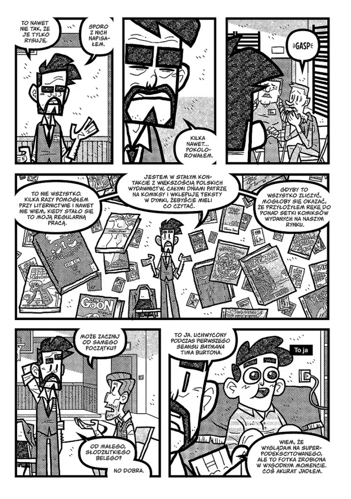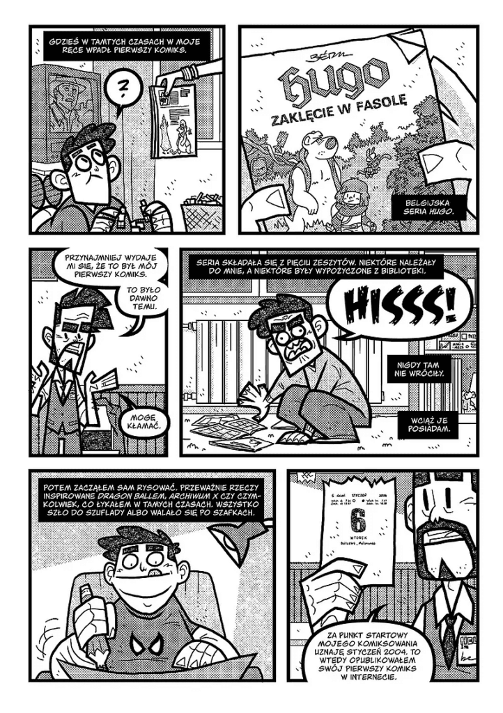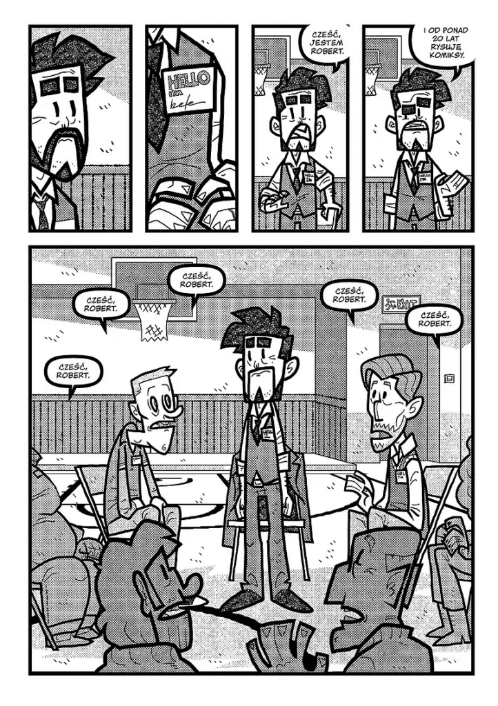 Robert przy komiksach robił praktycznie wszystko. Pisał je (Rycerz Janek i instrukcja prawidłowego składania ofiar zapomnianym bóstwom), rysował (Ostatni Pisarz), publikował w internecie (The Movie), naczelnie redaktorzył (Profanum) oraz przygotowywał do druku (Warchlaki i pewnie połowa komiksów, które masz na półce). Od kilku lat tworzy również autobiograficzny komiks o życiu twórcy autobiograficznego komiksu. To jest ten komiks.