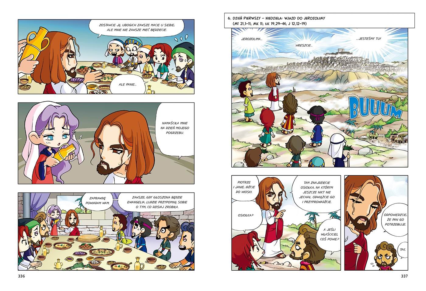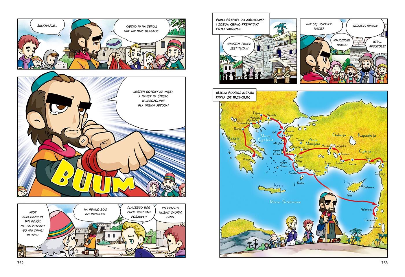 To komiksowe wydanie Biblii powstało, aby pomóc młodym czytelnikom poznawać Pismo Święte w sposób dostosowany do ich percepcji. W czasach gdy Internet, gry wideo, YouTube i media społecznościowe walczą o naszą uwagę, nowatorskie podejście do Biblii wydaje nam się ważnym krokiem w kierunku odkrywania i coraz lepszego poznawania historii zbawienia i miłości, w którą Bóg zaangażował ludzi. Swobodne dialogi komiksu i jego oryginalna szata graficzna z pewnością zachęcą starsze dzieci do pasjonującej i pełnej refleksji lektury.