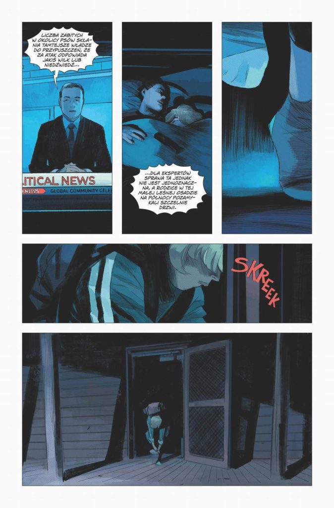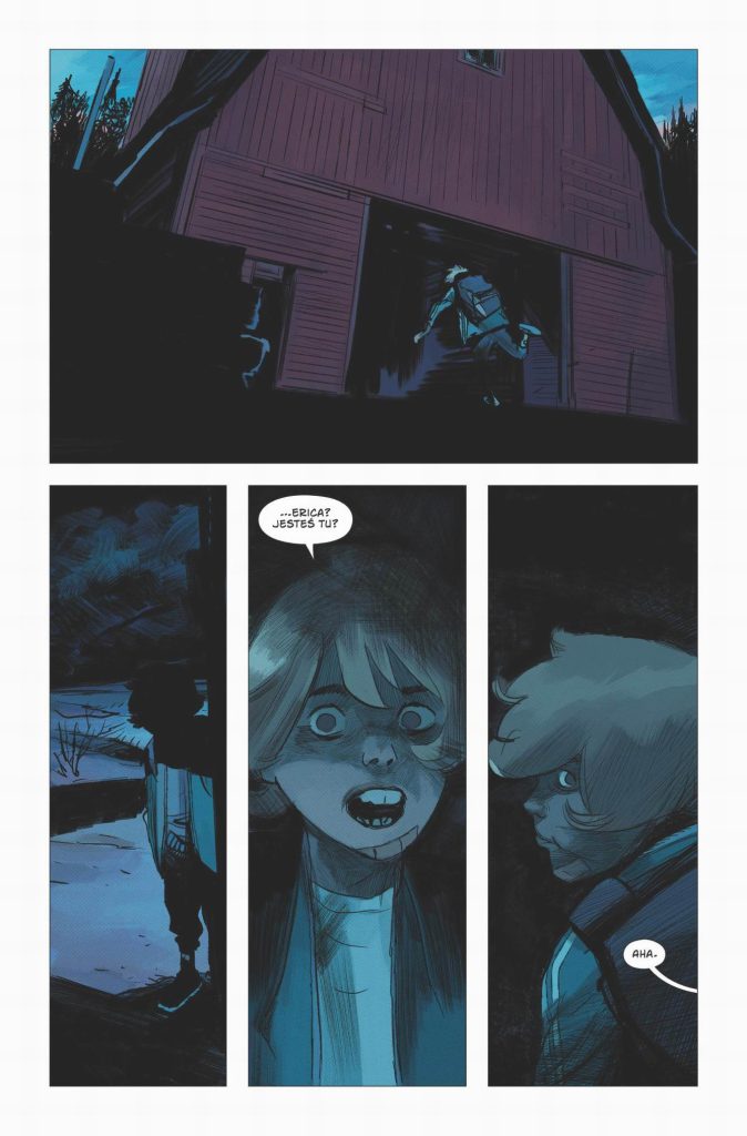 Te wspomniane wyżej widowiskowe pojedynki to zapewne coś, czego oczekuje wielu czytelników. W tym przypadku twórcy wcale nie zamierzają być dosłowni i traktują widowiskowość na trochę innych warunkach. Dlatego zamiast bezpośrednich morderczych starć możemy dostać ich pokłosie - tak jak w opowieści o rannej, z początku nieprzytomnej Erice, którą po walce z potworem znajduje w domku na drzewie grupka dzieciaków. Za to na pewno efektownie wygląda nie tyle walka, co strach i dezorientacja, a w końcu próba przetrwania pobocznych bohaterów podczas pojedynku Eriki z kolejnym potworem w nietypowej lokalizacji, czyli w supermarkecie. To najbardziej dynamiczna w zestawie opowieści z ósmej części “Coś zabija dzieciaki”, pokazująca również talent Tyniona IV we wprowadzaniu nowych postaci, które przecież wpadają do tej historii jedynie na chwilę, a i tak szybko nawiązujemy z nimi emocjonalną więź. To niewątpliwie kolejna zaleta tego tomu.