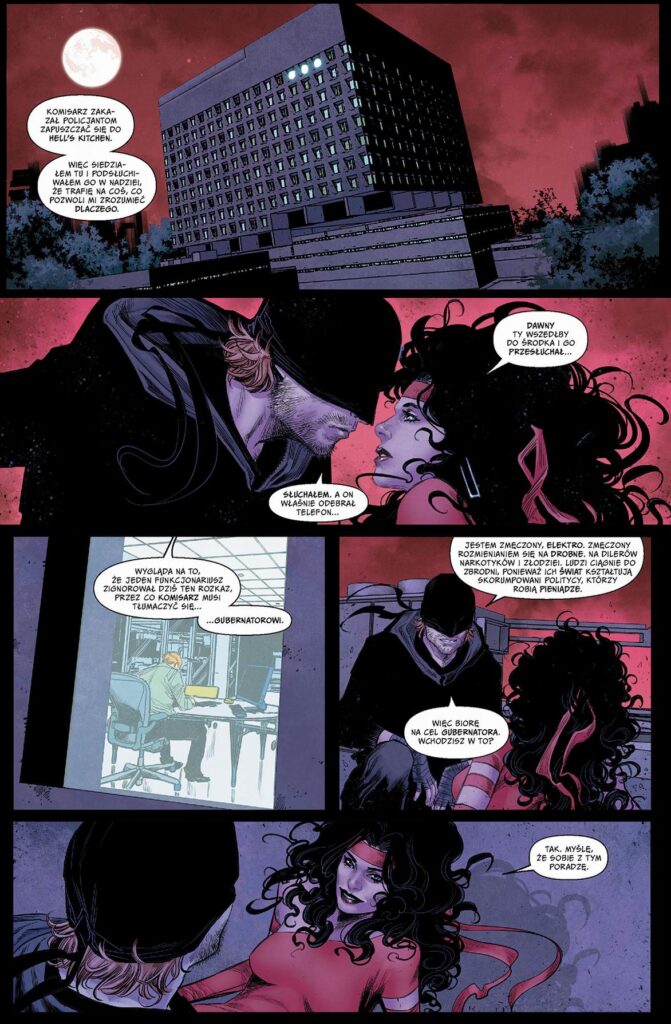Matt Murdock w tej historii potrafi irytować - właśnie ta mieszanina współczucia i irytacji rodzi się zarówno u czytelnika, jak i u Elektry, która w pewnym momencie pojawia się w fabule, by naprostować byłego kochanka. Ten do tego czasu zdołał do tego stopnia skomplikowali swoją sytuację, że zamiast niego, w kostiumie po Nowym Jorku biegają jego nieautoryzowani następcy, zarówno męskiej i żeńskiej płci, a on sam w tym czasie przeżywa różnego rodzaju rozterki, także te uczuciowe. Z tymi ostatnimi wiąże się kolejny ciekawy wątek - nowa kobieta w życiu Matta ma rodzinne konotacje z jedną z rodzinnych mafii z Nowego Jorku, co w udany sposób komplikuje fabułę. Zresztą w wątku mafijnym znowu widzimy podobieństwa do serialu. W czasie kiedy Wilson Fisk sprawuje urząd burmistrza, między przestępcami zaczynają się niesnaski. W komiksie prym w zaognianiu sytuacji wiedzie popędliwy Lelend Owlsley aka Owl, ale znacznie ciekawszą postacią jest ostrożna w działaniu, Isabella Libris, kobieca głowa mafijnej rodziny, do której na obiad wpadnie z zaskoczenia (również zaskoczony tym faktem) Matt Murdock.