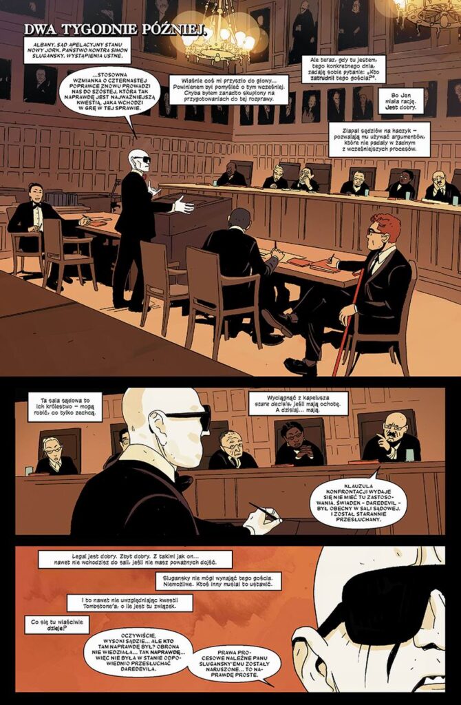 Ta część komiksu dzieli się na kilka etapów. W pierwszym Kingpin zamierza zdewaluować wywalczone przez Murdocka osiągniecie w Sądzie Najwyżsym. W drugim ponownie pojawia się na scenie Muza - jeden z teoretycznie najgroźniejszych złoczyńców, który niestety nie jest dobrze wykreowaną postacią (zobaczymy jak sprawdzi się w serialu) i generalnie wygląda to tak, jakby powrócił na scenę, by dopełnić wątek Blindspota, którego wątek notabene również nie grzeszy oryginalnością, ale cóż, trzeba jakoś wypełnić fabułę. Szkoda tylko, że kolejne wypełnienie jest niczym królik wyciągnięty z kapelusza. Do akcji bowiem wkracza Dłoń w spektakularnym ataku na Nowy Jork i sprawy mocno się komplikują dla wszystkich bohaterów.