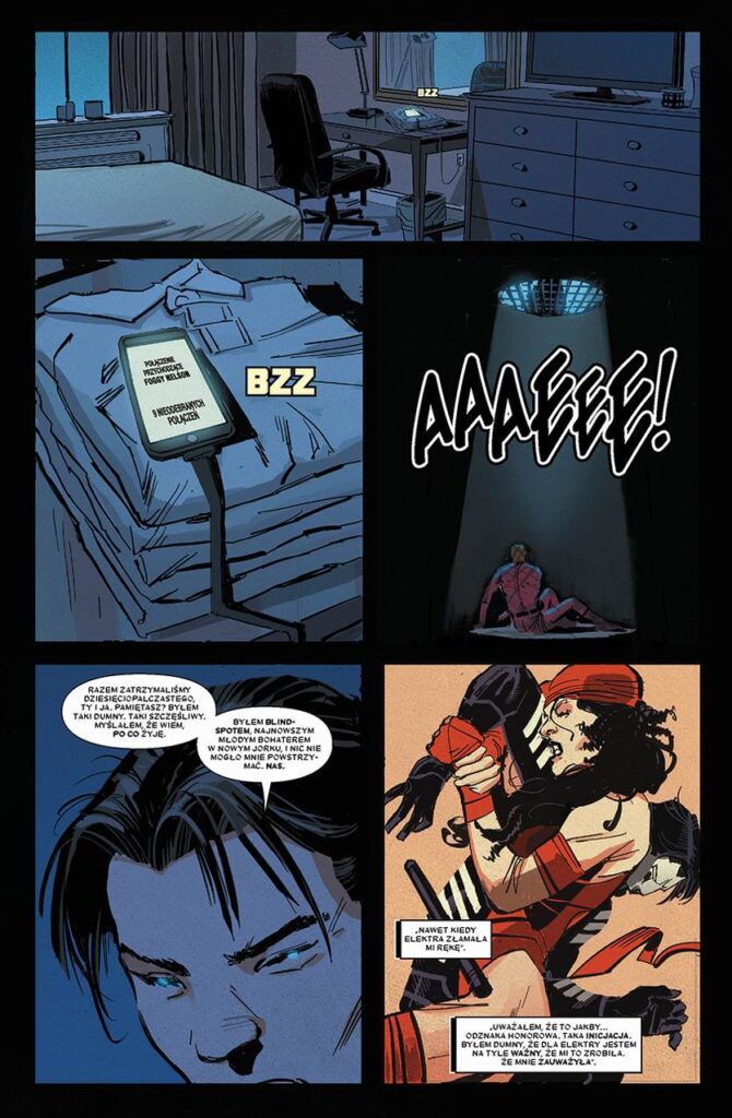Pomysł na wykorzystanie tej postaci, choć z początku wydaje się niedorzeczny, stanowi paliwo twórcze dla całej historii, która w pewnym momencie wchodzi, zgodnie z jej tytułem w poważniejsze tony. Także rysunki Philippa Noto nawiązujące do stylu Alexa Maleeva, którego pamiętamy ze współpracy z Brianem Michaelem Bendisem, nadają opowieści nieco inny, refleksyjny ton, choć trzeba powiedzieć, że w runie Charlesa Soula rysownik Ron Garner, szczególnie w pierwszym tomie “Znowu w czerni” wykonał bardzo dobrą robotę. Opowieść o śmierci Daredevila z każdym zeszytem robi się coraz bardziej intrygująca i prowadzi do zaprawdę zaskakującego finału. W tym momencie już mocno rozchodzi się z fabułą serialu, który przecież nosi tytuł stanowiący przeciwieństwo śmierci superbohatera, czyli odrodzenie. Kończymy lekturę tomu poruszeni jego konkluzją, ale jednocześnie nie zapominamy, że scenariusz Charlesa Soula był rodzajem twórczej sinusoidy - raz było lepiej, raz gorzej. Ważne, że w finale forma odchodzącego scenarzysty wyraźnie zwyżkowała. A co nowego czeka nas w premierowej odsłonie ze scenariuszem Chipa Zdarsky’ego, oprócz tego, że przygody Daredevila będą teraz wydawane w miękkiej oprawie, już można sprawdzić samemu.