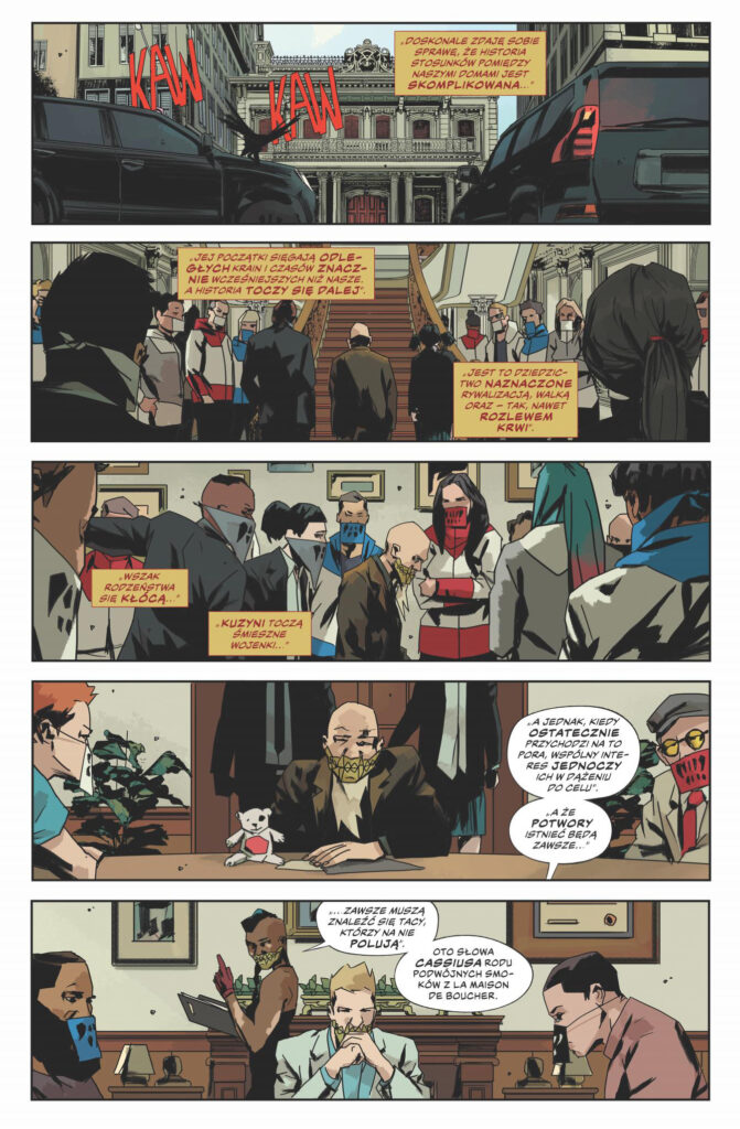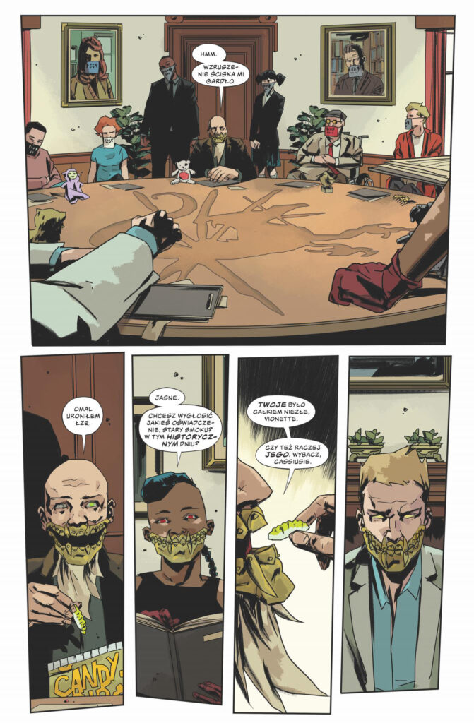 I tak właśnie, w takt kolejnych, wyprowadzanych przez obie strony ciosów toczy się fabuła. Są w niej niestety momenty kiedy opowieść traci na sile, bo tak naprawdę nie za bardzo wiemy dokąd zmierza i czy w jakiś konkretny sposób zepnie się z fabułą głównej serii. Wiemy, że ów świat ma potencjał, ale ów rodzaj umowności, o którym wspominałem wyżej wpływa również na nasz odbiór. Jest tak, że przy Erice bardziej wszystkim się przejmujemy, a przy opowieści o Rzeźniku już nie w takim stopniu. Jakby nie do końca udało się twórcom zbudować emocjonalną więź między nim a odbiorcą. Nie wiem, czy to tylko moje wrażenie, ale właśnie z tych powodów mam poczucie, jakby seria kręciła się w kółko. Wierząc jednak w talent osoby odpowiedzialnej za cały ów projekt, mam nadzieję, że James Tynion IV wyprowadzi (lub podpowie scenarzyście niniejszej serii, jak wyprowadzić) “Dom Slaughterów” na prostą.