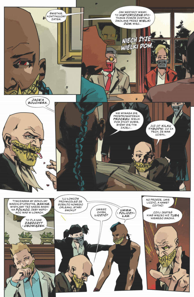 Skoro w tytule jest wojna, to możemy się spodziewać, że na planszach komiksu zobaczymy wiele scen walk. I niby tak jest, ale specyficzna maniera rysowania Antonio Fuso sprawia, że cała tę widowiskowa z założenia część fabuły wygląda bardziej umownie niż realnie - co zawsze było siłą głównej serii o wymyślonych, materializujących się potworach. Zamiast zatem szykować się na widowiskową jatkę, bardziej bądźmy gotowi na rodzaj fabularnych szachów wspartych testowaniem różnych emocjonalnych więzi. W efekcie dostajemy planowanie i kontrataki, ale przy wykorzystaniu emocjonalnych nacisków - takim jest choćby włączenie do akcji Sunny'ego, który wylądował w Zakonie pod opieką Jolie i teraz jego opiekunowie planują wykorzystać go w celu wyeliminowania Jace’a. Dostajemy jeszcze kolejną intrygującą postać - tajemniczą Maven, która pomaga tytułowemu bohaterowi w opiece nad dzieciakami. Z pozoru emocjonalnie stonowana, pokaże w swoim czasie swój niecodzienny potencjał w całej okazałości. Ale też sam Jace trafi na godnego siebie przeciwnika, który zachwieje jego wiarą w zwycięstwo.