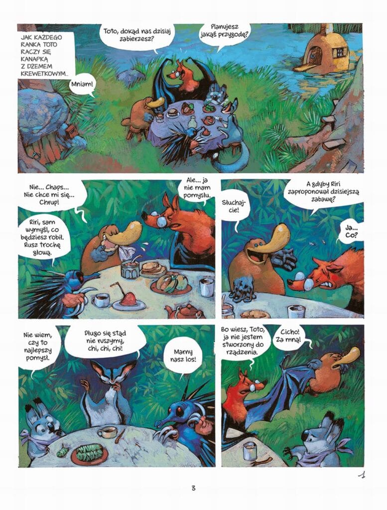 To szósty album z serii opowieści o dziobaku Toto i jego przyjaciołach: kolczatce Chichi, koali Wawie i nietoperzu Riri.