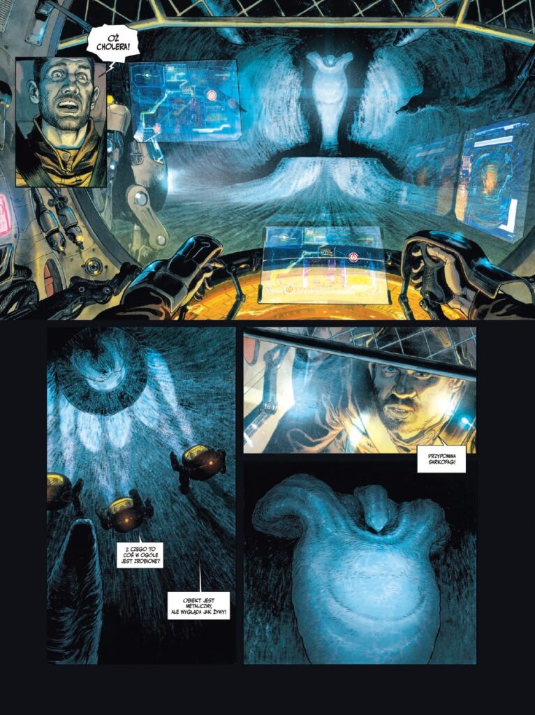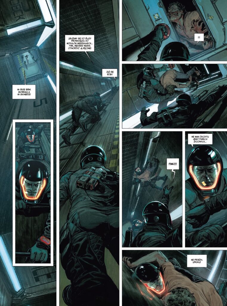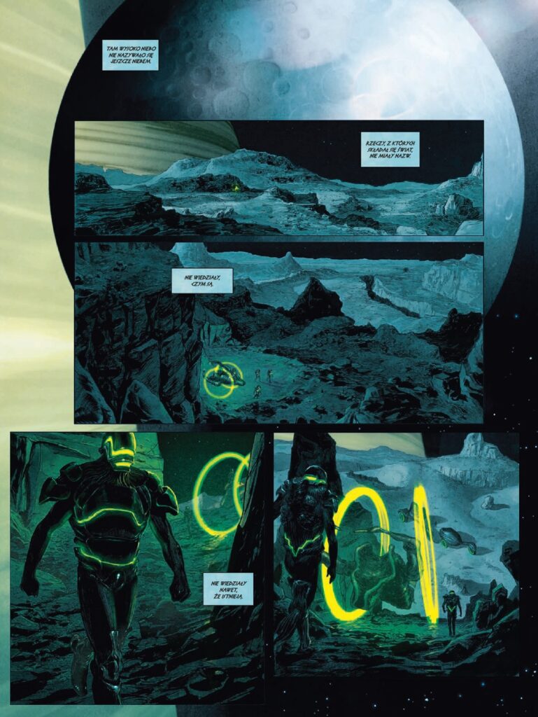Nie sposób jednak mówić o „Eternum” bez wspomnienia o wizualnej stronie albumu. Rysunki JaouenaSalaüna to prawdziwa uczta dla oczu. Artysta z niezwykłą dbałością o detal tworzy scenerie, w których technologia i przestrzeń kosmiczna mają ciężar potrafią wręcz przygnieść ciężarem. Zmienia perspektywy, gdy trzeba — raz daje nam szerokie, filmowe panoramy oddające gigantyczną skalę przedstawianych obiektów, by za chwilę zbliżyć się do klaustrofobicznych wnętrz baz badawczych. Świetnie wypada też kolorystyka albumu- raz nasycona, a kiedy indziej chłodna i industrialna, emanująca tym specyficznym nastrojem przyszłości, która wydaje się naturalnym przedłużeniem naszej teraźniejszości.