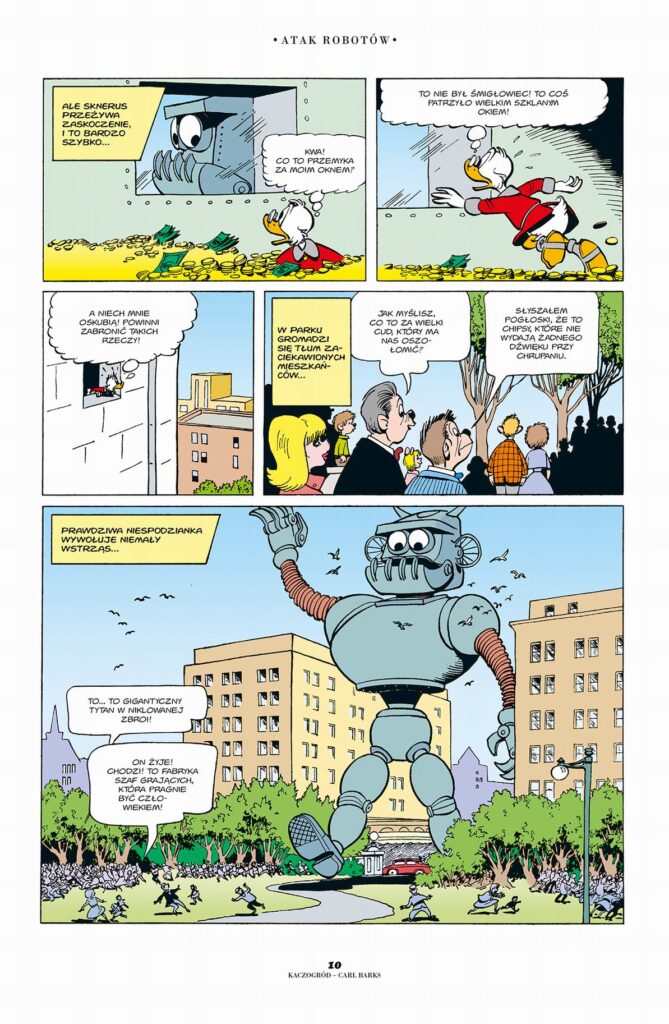 Tytułowy „Atak robotów” to rozgrywająca się w Kaczogrodzie historia, w której spokojne życie mieszkańców po raz kolejny przerywają Bracia Be. W rodzinnym mieście Donalda toczy się także akcja komiksu „Upiór w katedrze”. Tutaj Barks miał okazję popisać się umiejętnością rysowania elementów gotyckiej architektury. W pozostałych dłuższych opowieściach Sknerus, a także Donald i siostrzeńcy odbywają podróże, czy to bliższe – jak w „Bagnach Zapomnienia”, czy też bardzo egzotyczne, jak w „McKwaczu z Arabii” bądź „Kaczorach na safari”. Dwie z owych wypraw mają bezpośredni związek z przeszłością Sknerusa jako poszukiwacza złota i nic dziwnego, że z tych opowieści obficie czerpali późniejsi kronikarze życia najbogatszego kaczora świata – Don Rosa i Kari Korhonen. Komiks „Nad rzeką Jukon” to debiut Śliskiego Kręta, lichwiarza i antagonisty Sknerusa. W „Pociągu z miasta duchów” pojawia się z kolei inny jego przeciwnik – Twardogłowy McSkunks.
