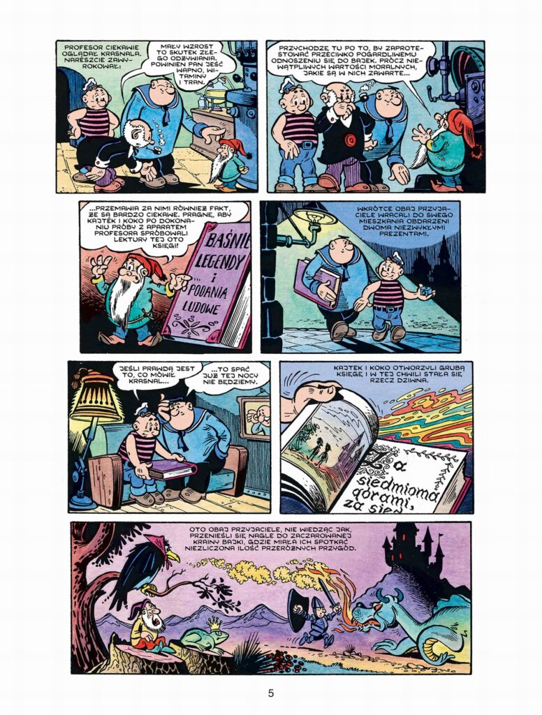 Komiksy ukazywały się w „Wieczorze Wybrzeża” w latach 1963–1964. W niniejszym wydaniu plansze są po całkowitej renowacji i po raz pierwszy w całości w kolorze. Komiks to pełna magii i łamania schematów opowieść o wędrówce dwóch przyjaciół Kajtka i Koka przez krainę baśni. Bohaterowie testują nowy wynalazek profesora Kosmosika – aparacik do przesyłania przedmiotów na odległość – i przenoszą się do świata baśni. W pierwszej części Christa w typowy dla siebie humorystyczny sposób przekręca popularne bajki, wplatając w nie naszych bohaterów. W krótkich opowiastkach pojawiają się Jaś i Małgosia, trzy świnki, brzydkie kaczątko, złota rybka, Śpiąca Królewna i Czerwony Kapturek.