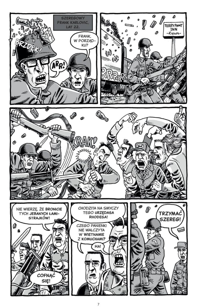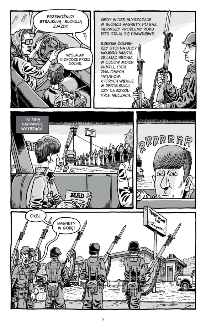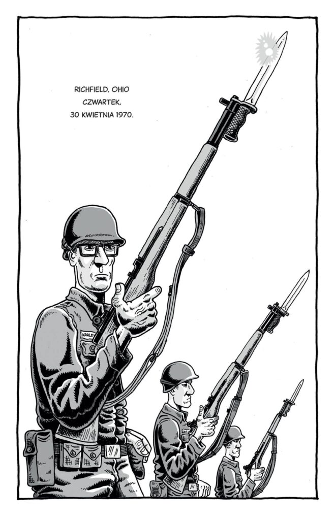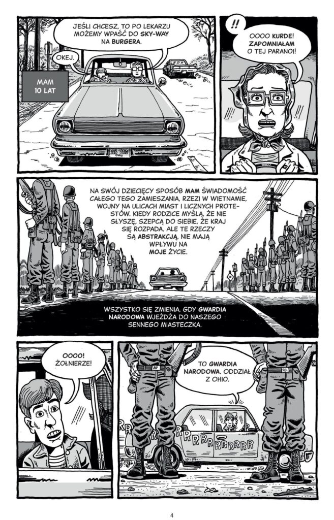 4 maja 1970 roku na uniwersytecie Kent State w Ohio, Gwardia Narodowa otworzyła ogień do bezbronnych studentów, protestujących przeciwko wojnie w Wietnamie. W zabójczej kanonadzie, w której oddano sześćdziesiąt siedem strzałów, zginęło czworo studentów, a dziewięcioro zostało rannych. Te zdarzenia wypaliły się w narodowej pamięci jako dzień, w którym Ameryka zwróciła broń przeciw własnym dzieciom. Kilka dni wcześniej dziesięcioletni Derf Backderf widział w pobliskim mieście patrole tych samych gwardzistów. Zostali tam wysłani, by stłumić strajk kierowców ciężarówek. Wykorzystując swoje dziennikarskie zdolności, które pokazał w komiksach My Friend Dahmer i Śmieci, Backderf przeprowadził mnóstwo wywiadów i dogłębnie przeanalizował wiele materiałów, by przedstawić życie czwórki młodych ludzi oraz wydarzenia czterech majowych dni, podczas których kraj stanął na krawędzi rozpadu.