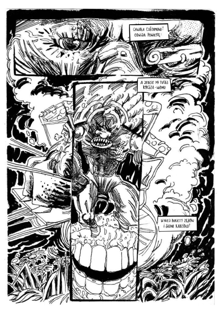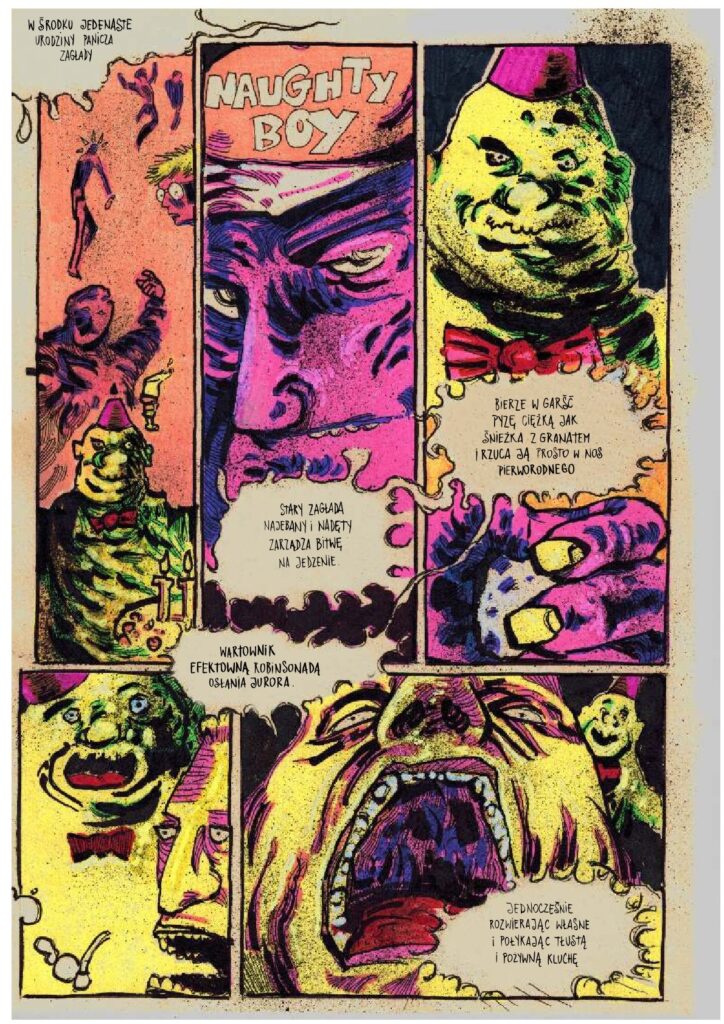 W plastyce kadrów jest dużo niepokoju, nierównego rytmu i nie można żadnego ujęcia odczytać jednoznacznie. Perspektywa nie istnieje, odrealnia się, wszystko razem ostatecznie się rozmywa, jest bliskie abstrakcji. Tusz miesza się z farbą akrylową, jej warstwa się odkleja, tworzy kolaż i jest tam gdzieś słowo, które się rozlewa po ulicy i spływa ze ścian.
