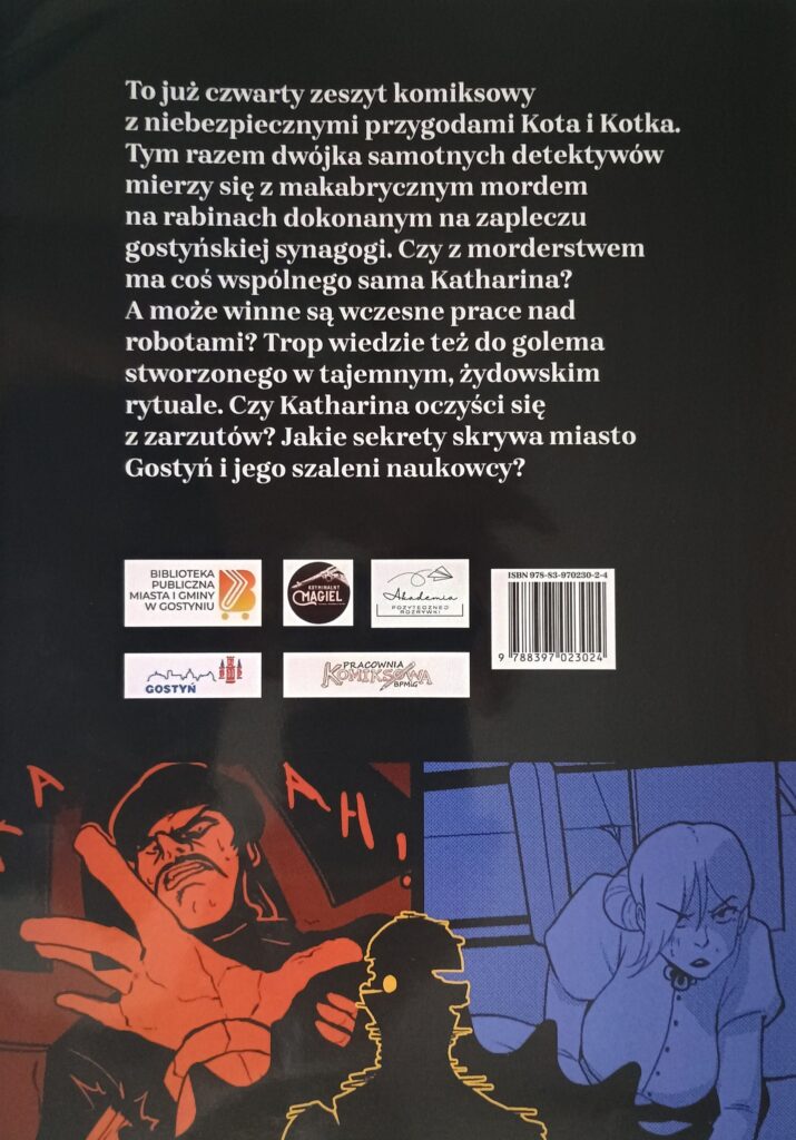 To już czwarty zeszyt komiksowy z niebezpiecznymi przygodami Kota i Kotka. Tym razem dwójka samotnych detektywów mierzy się z makabrycznym mordem na rabinach dokonanym na zapleczu gostyńskiej synagogi. Czy z morderstwem ma coś wspólnego sama Katharina? A może winne są wczesne prace nad robotami? Trop wiedzie też do golema stworzonego w tajemnym, żydowskim rytuale. Czy Katharina oczyści się z zarzutów? Jakie sekrety skrywa miasto Gostyń i jego szaleni naukowcy?
