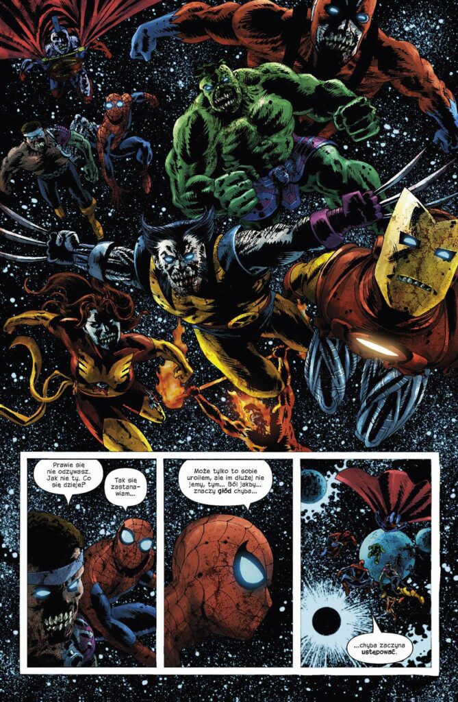 Przemienieni w żywe trupy superbohaterowie Marvela opuścili Ziemię, ale nawet wszechświat nie był w stanie zaspokoić ich żądzy krwi! Czy po powrocie do domu znowu będą pożerać ludzi? Czy też nauczą się, jak przezwyciężyć swój nienasycony głód? Tymczasem Machine Man, Jocasta, żywy wampir Morbius, Wilkołak Nocą i Syn Szatana próbują powstrzymać epidemię powodującą przemianę bohaterów w zombie. Nie wiedzą jednak, że w ich szeregach czai się zdrajca… Być może to nie oni, ale nękany poczuciem winy Spider-Man zdoła zapobiec powtórce z historii?