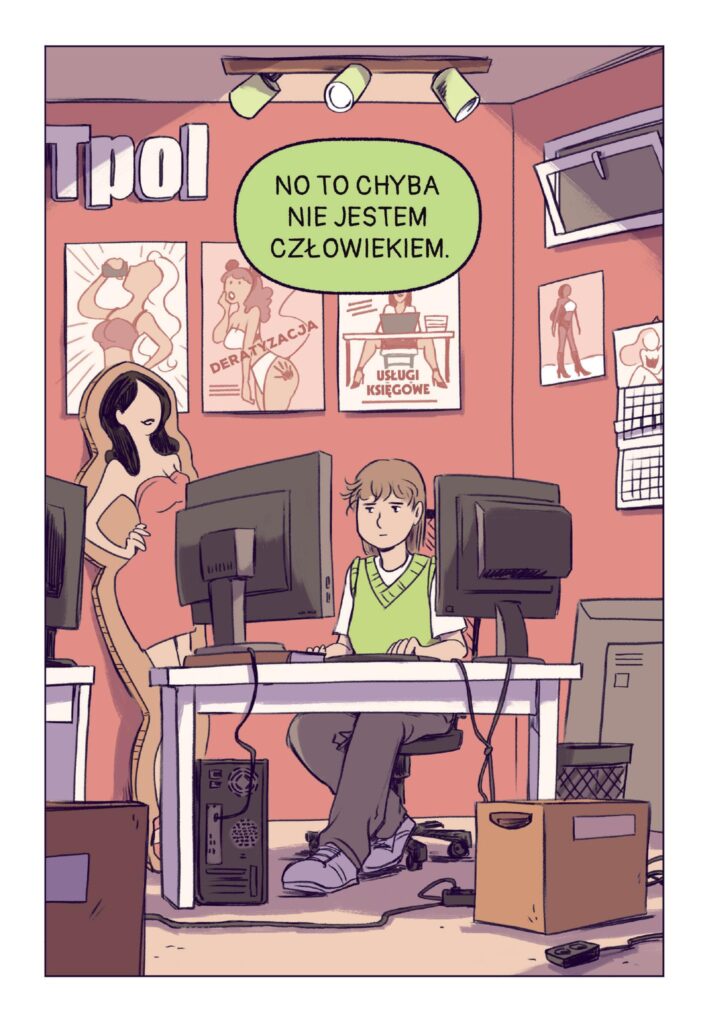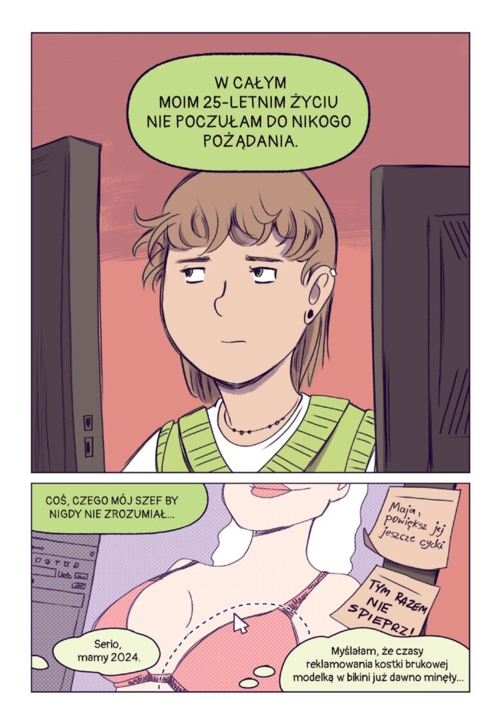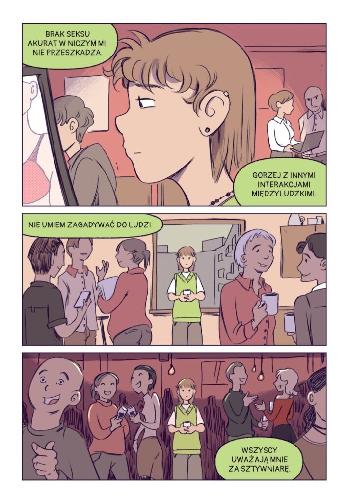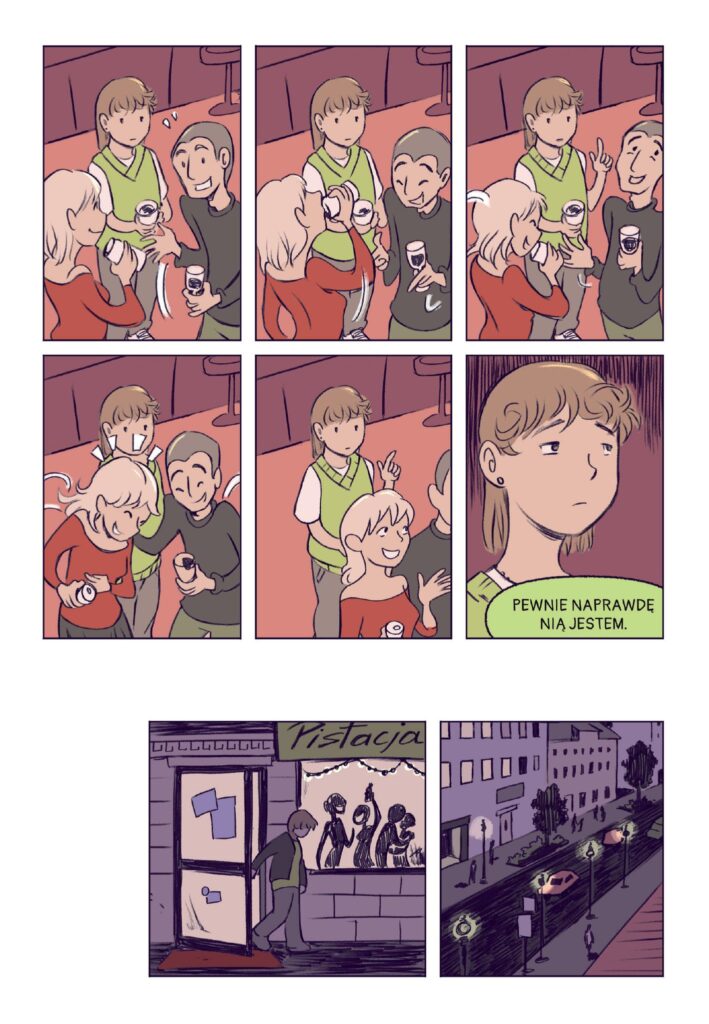 Zawsze gdy widzę obietnicę reprezentacji ace w danym utworze to mam obawy, czy orientacja bohaterów będzie miała jakikolwiek znaczący wpływ na fabułę, czy też pozostanie dla czytelnika suchym faktem. Jednak w przypadku tego komiksu mogę z czystym sumieniem zapewnić, że autorka wykonała kawał świetnej roboty przy tworzeniu głównej bohaterki. Podejście postaci do życia, relacji międzyludzkich, postrzegania siebie i wszelkich problemów stających na jej drodze naprawdę ze mną rezonowały podczas lektury i myślę, że wiele innych osób również odnajdzie siebie w tym komiksie. – Aleska Słowik