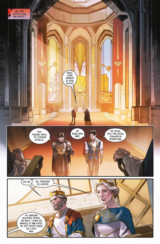 Często opiera się to na zgadywankach - kim na przykład enigmatyczny Zielony Człowiek, który steruje wydarzeniami i zaognia spór między tytułowymi królestwami? Albo jeszcze inaczej - najchętniej czekamy na zaskoczenia, których w ogóle się nie spodziewamy, a doświadczony Tom Taylor odpowiada na te oczekiwania i daje nam na przykład fajną woltę w przypadku postaci obecnego w fabule Alfreda. Tego rodzaju niespodzianki scenarzysta wyciąga niczym królika z kapelusza, a jest ich więcej, często związanych z żeńskimi bohaterkami. Ciekawie wypada tu Zala - siostra Supermana, czy przewrotna Harley Quinn, która w komiksie pełni rolę błazna na królewskim dworze. Mamy też Wonder Woman - bo tym trzecim królestwem uwikłanym w wojnę jest domena Amazonek z Temiskiry, a chyba najbardziej interesującą postacią w fabule i tak jest Lara, matka Kal-Ela, która jest tu ciekawiej wykreowana niż Batman i Superman razem wzięci.
